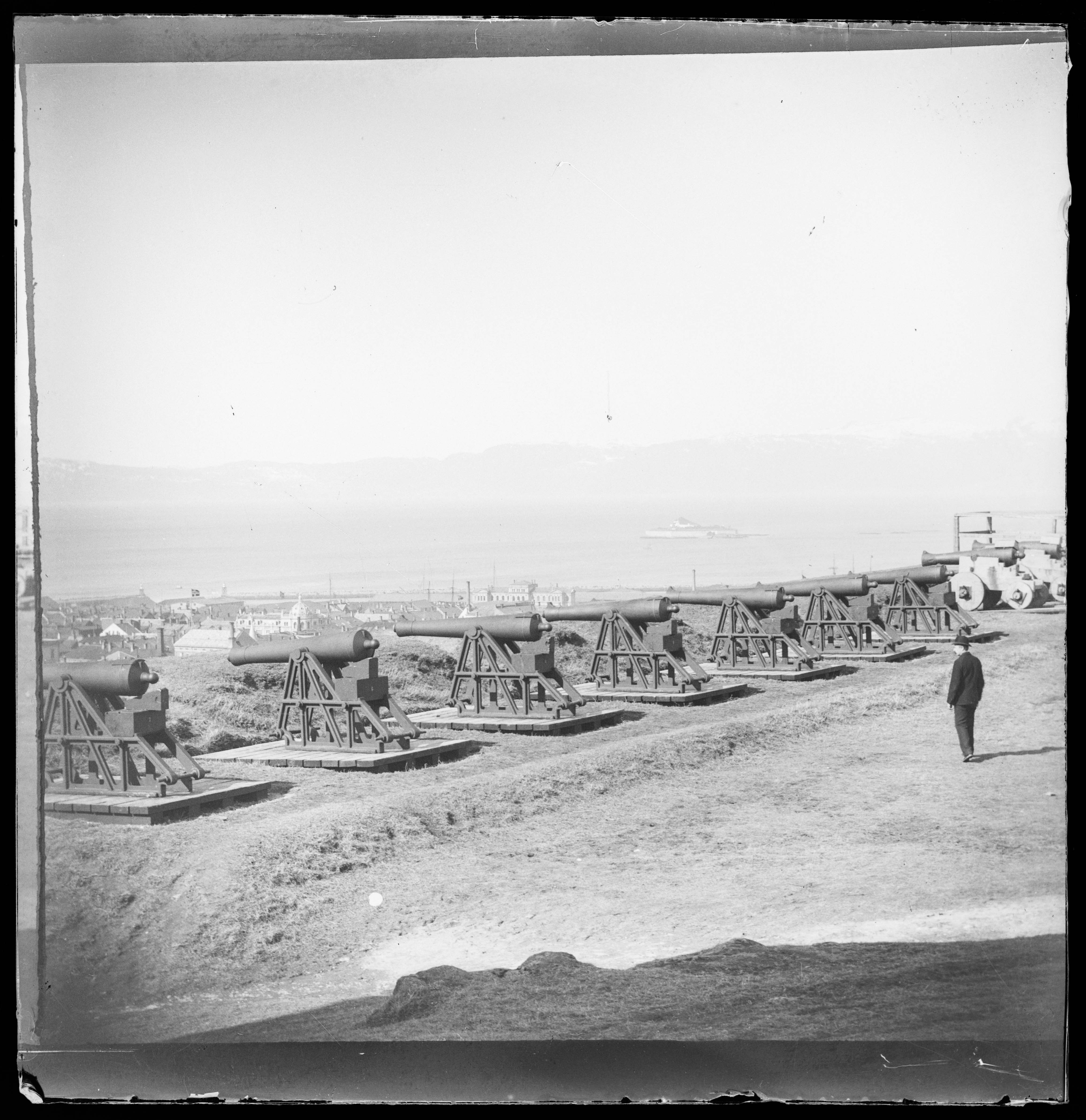 I forgrunnen kanonene på Kristiansten festning. Under festningsvollen ligger byen.