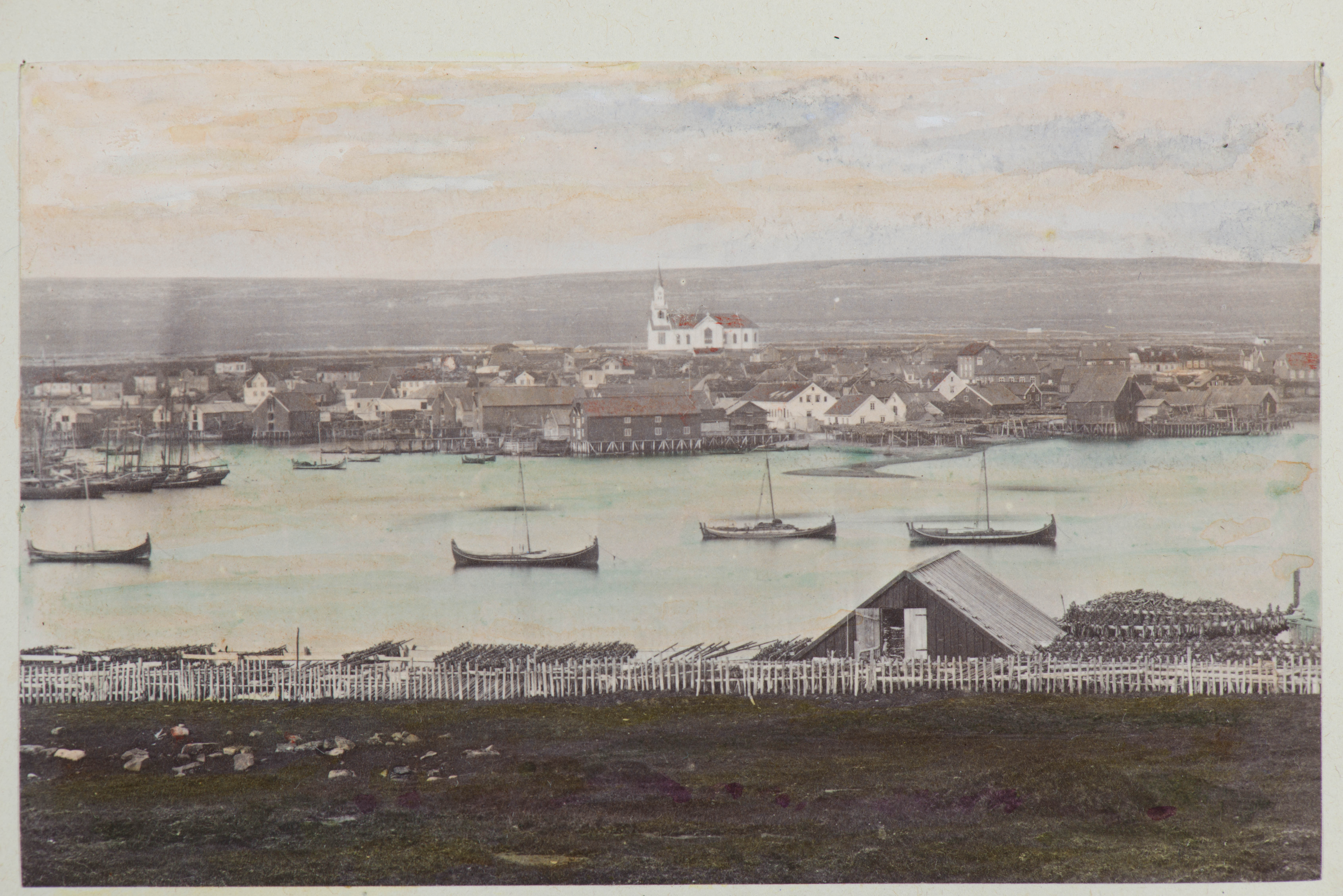 Vadsø sett fra Øya. I bakgrunnen, kirken, i forgrunnen, et sund med båter.