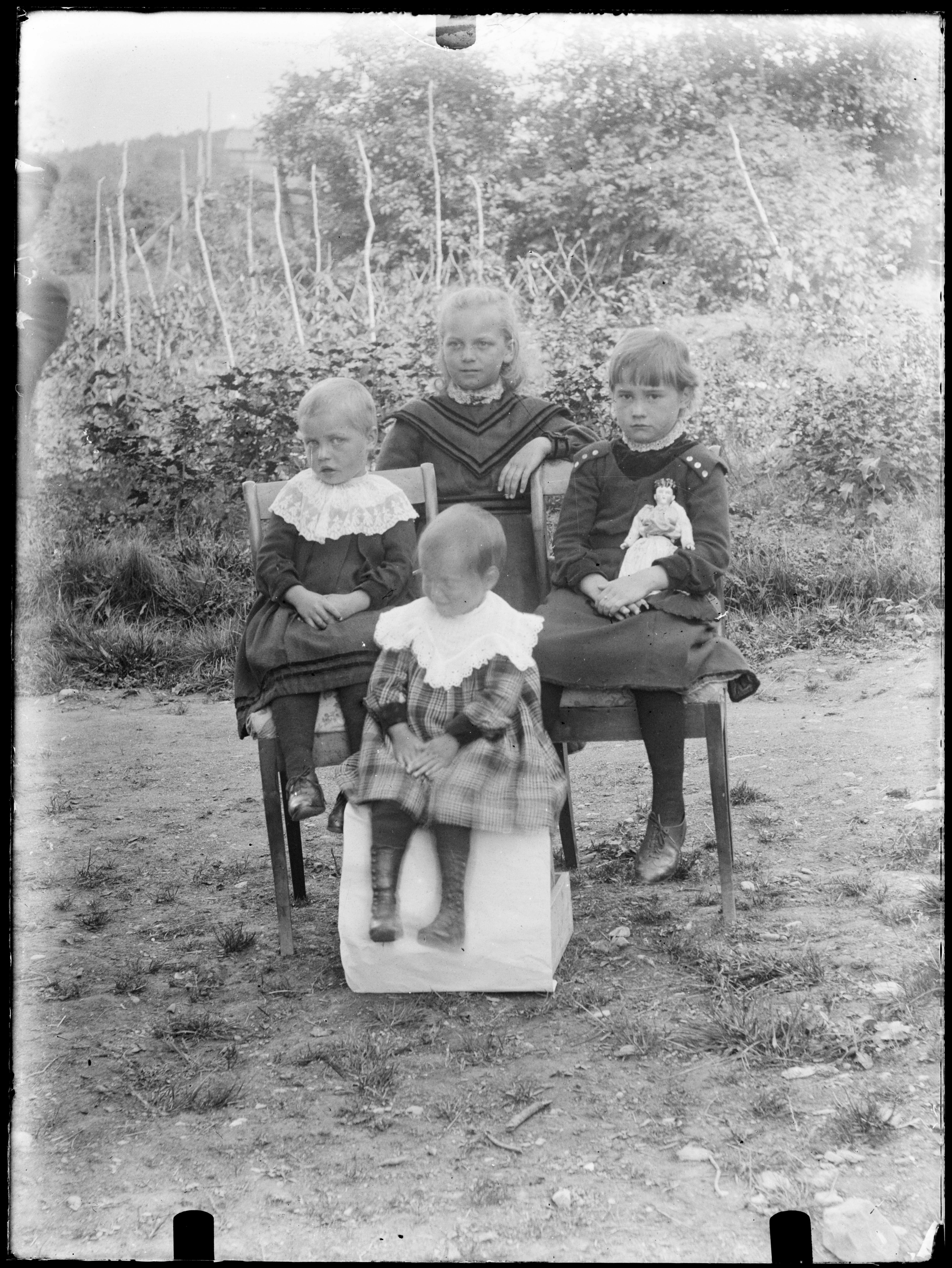 Fire barn utendørs. To av dem sitter på stoler, hvorav en holder en dukke. I bakgrunnen skimtes en voksen person, samt busker og en bygning