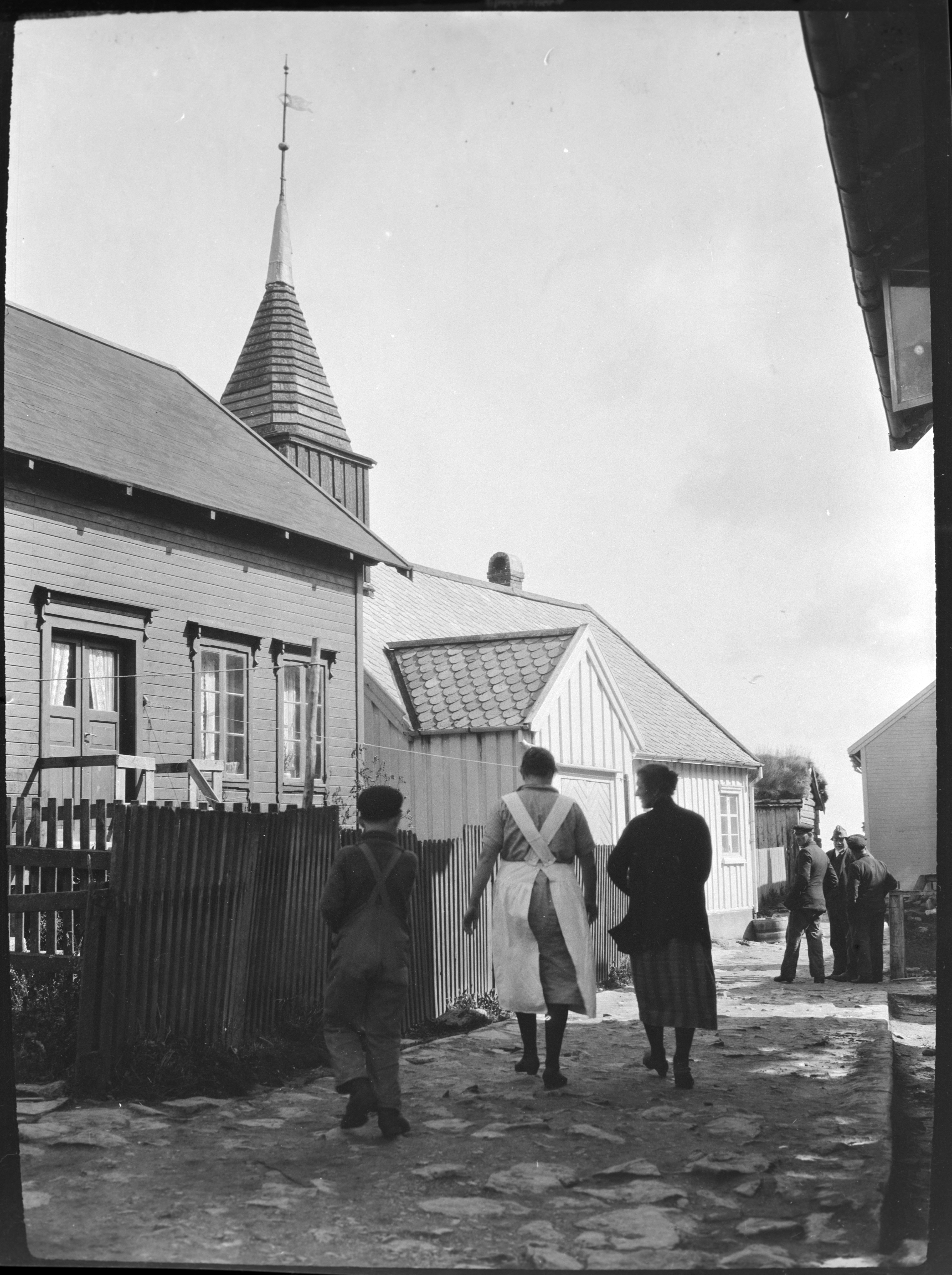 Gatebilde fra øya Gripsholmen utenfor Kristiansund, med Grip stavkirke. Nede i gaten ses Ole Nordgaard (iført lue) m.fl. Nordgård reiste sammen med Carl Dons.
