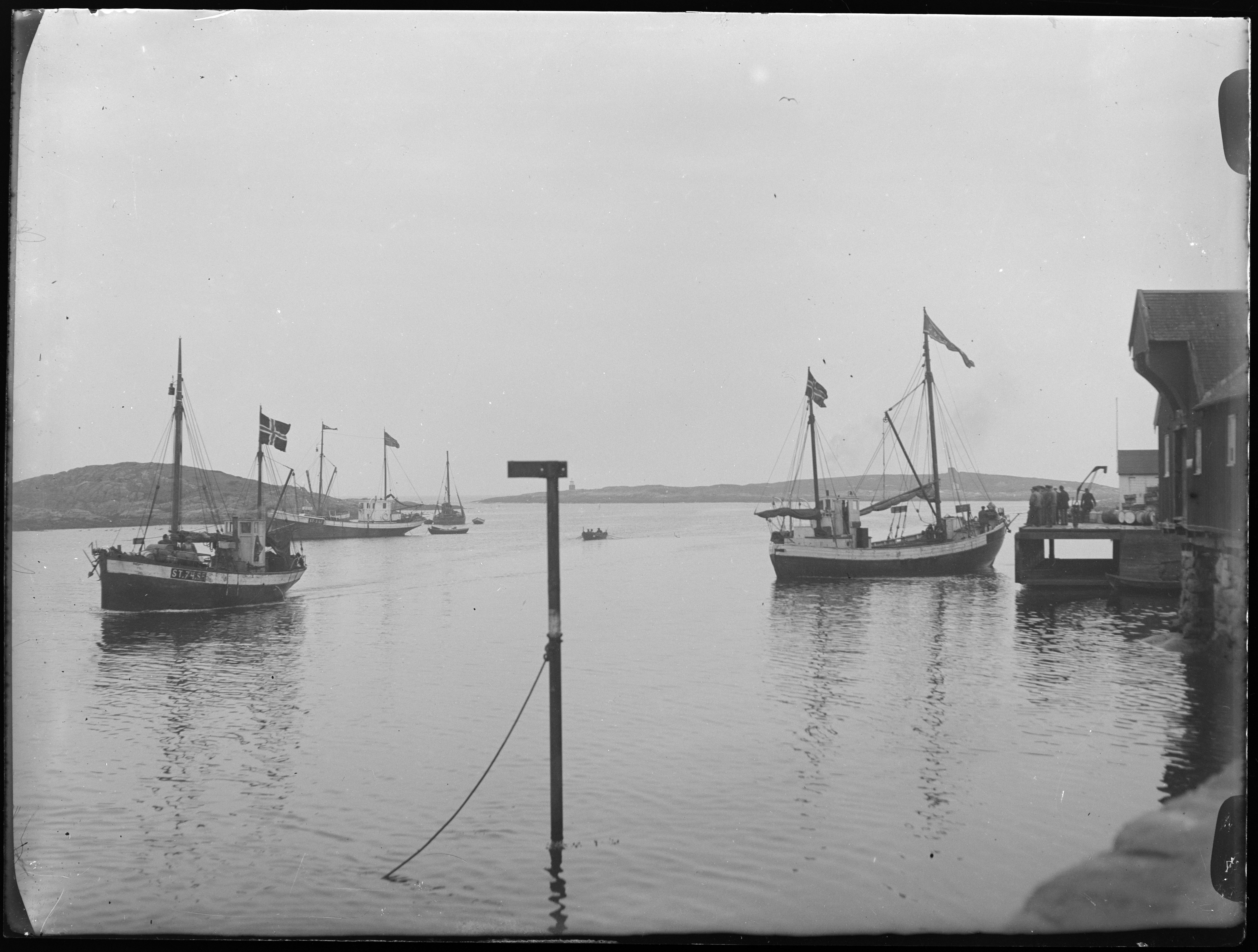 Flaggende båter ved havn