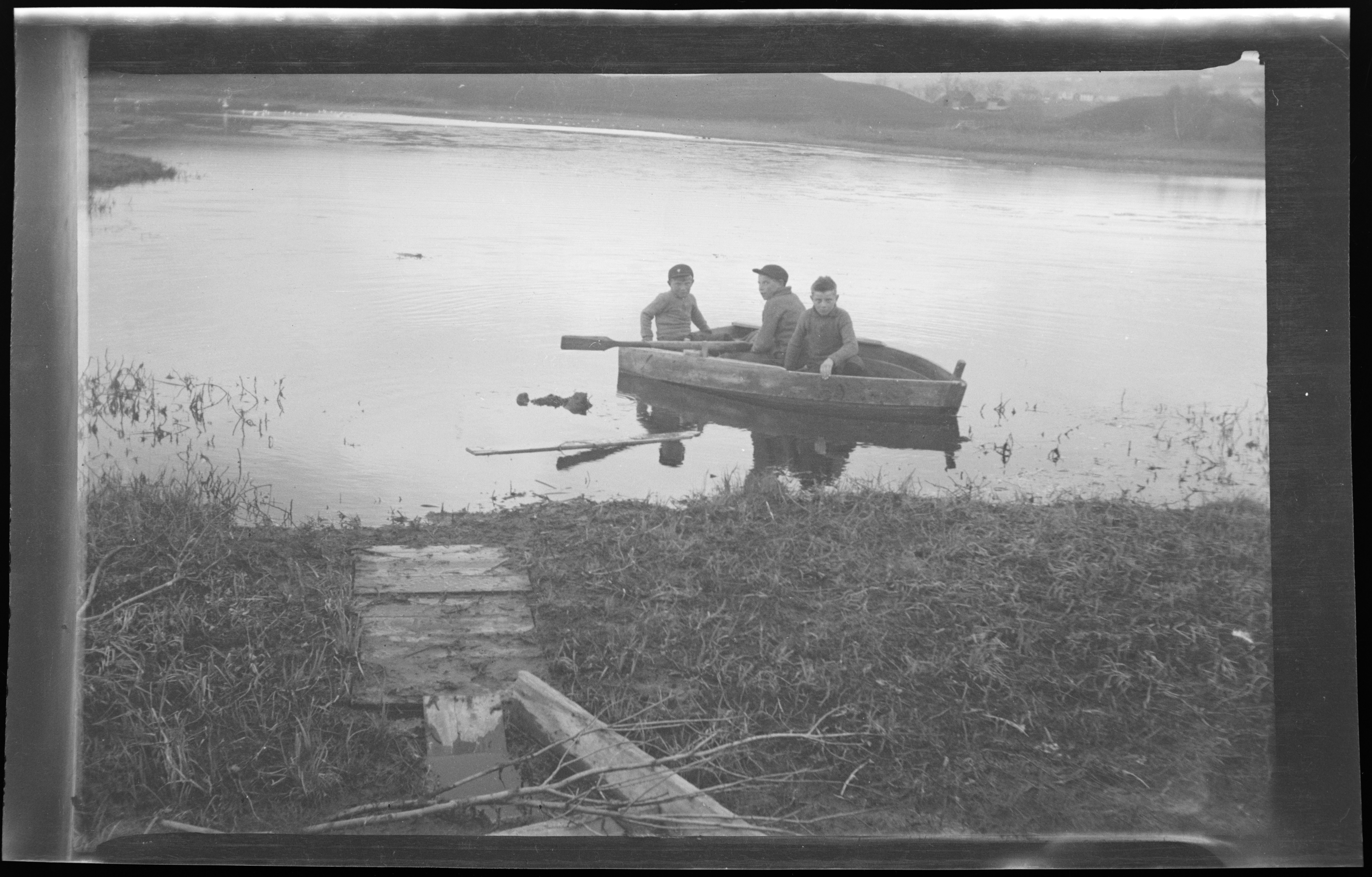 Tre gutter sitter i en robåt muligens ved Sørnypvatnet.
