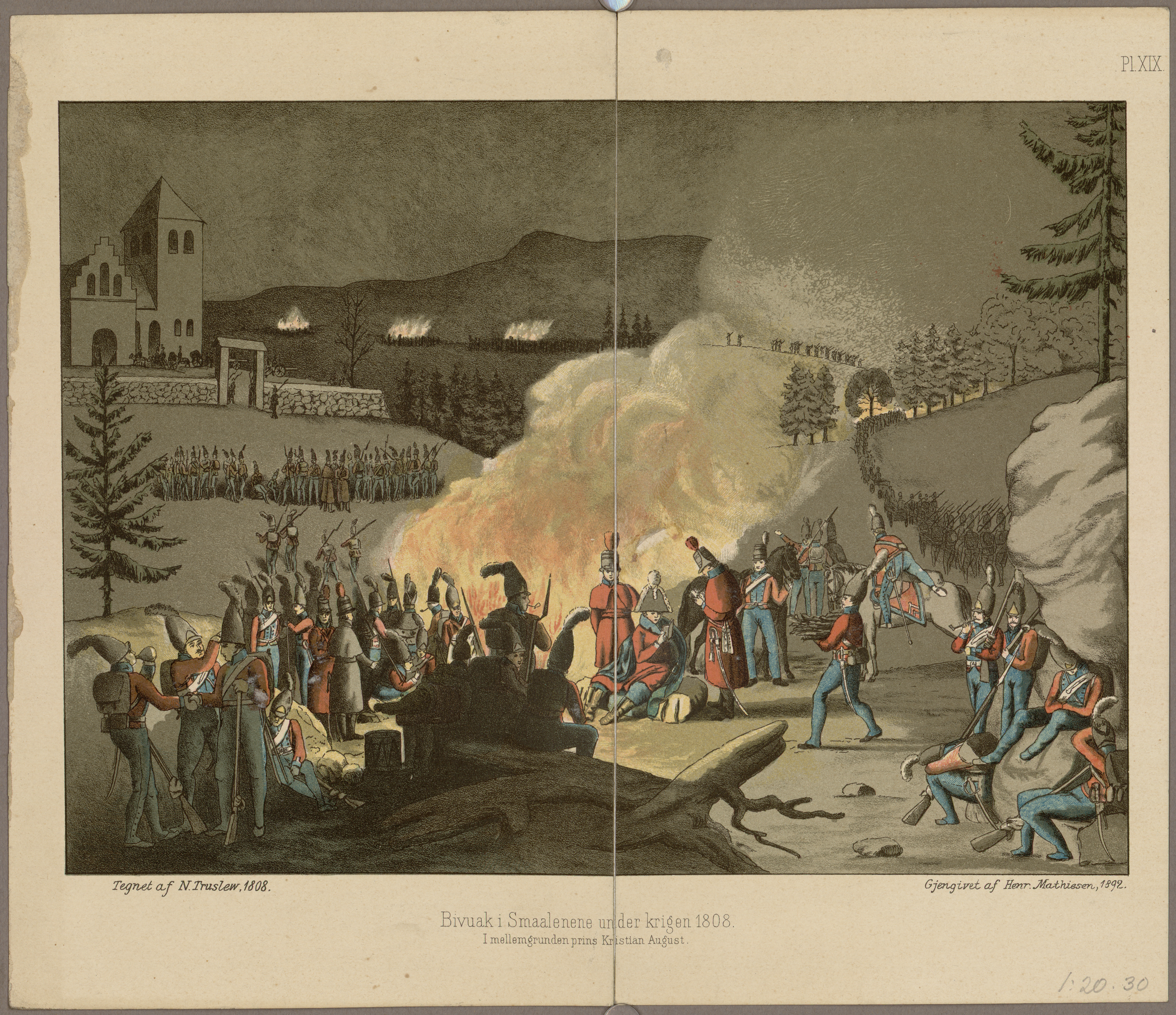 Bivuak i Smålenene under krigen 1808. Tegnet av N.Truslew 1808. Gjengitt av Henr. Mathiesen 1892.