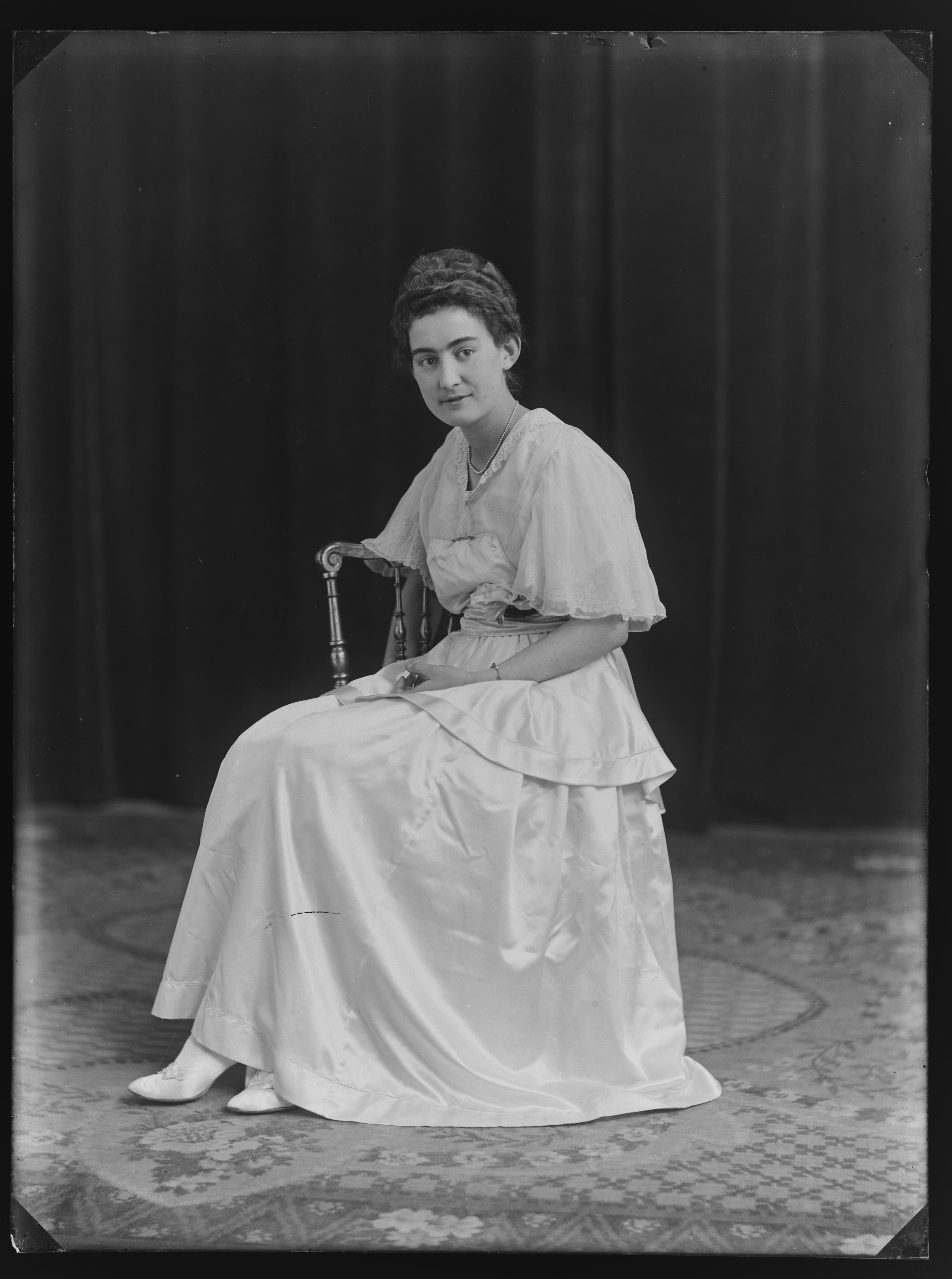 Portrett av kvinne i lys kjole sittende på stol i atelier, helfigur