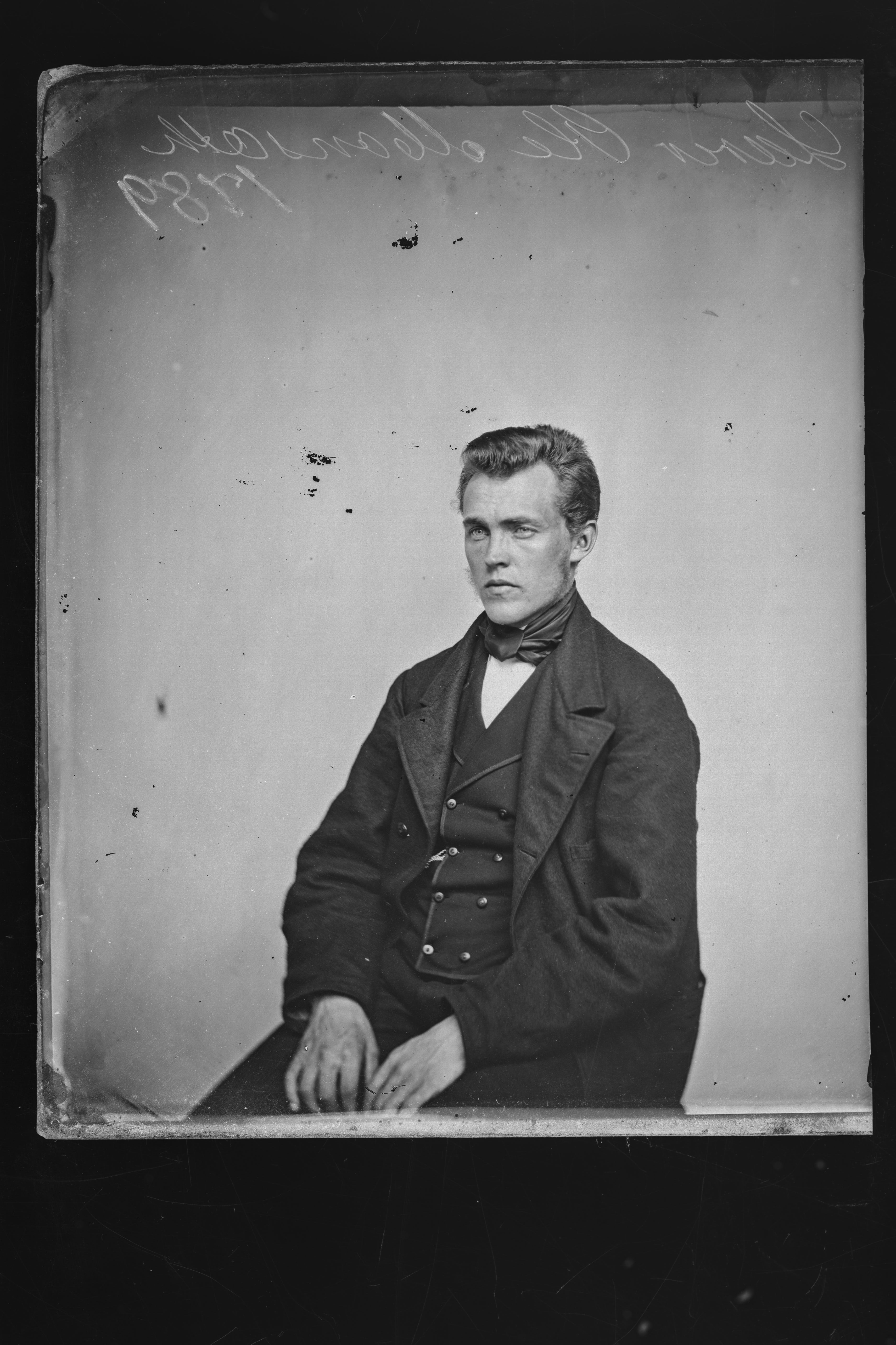 Monsæth, O., Lærer, "Lærer O. Monsæth" er risset inn i glassnegativets emulsjon. Vi antar at det er yrket og navnet til den avfotograferte. En mulig identifisering kan være skolelærer og gårdbruker Ole Arntsen, f. 1844 i Monsæth.