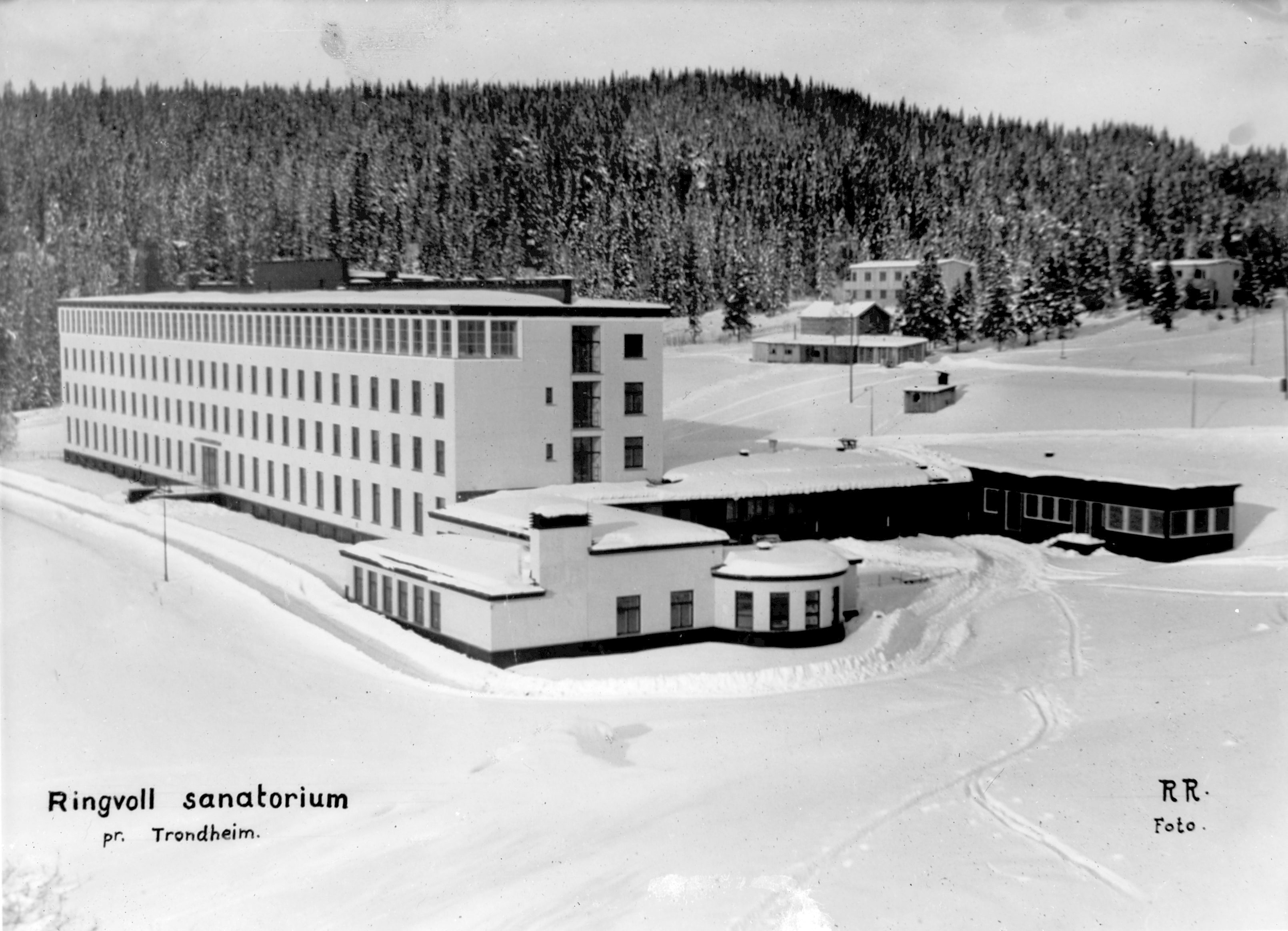 Ringvoll Sanatorium vinterstid. En stor blokkbygning og en mindre bygning. Bebyggelse bak. Skogsområde i bakgrunnen.