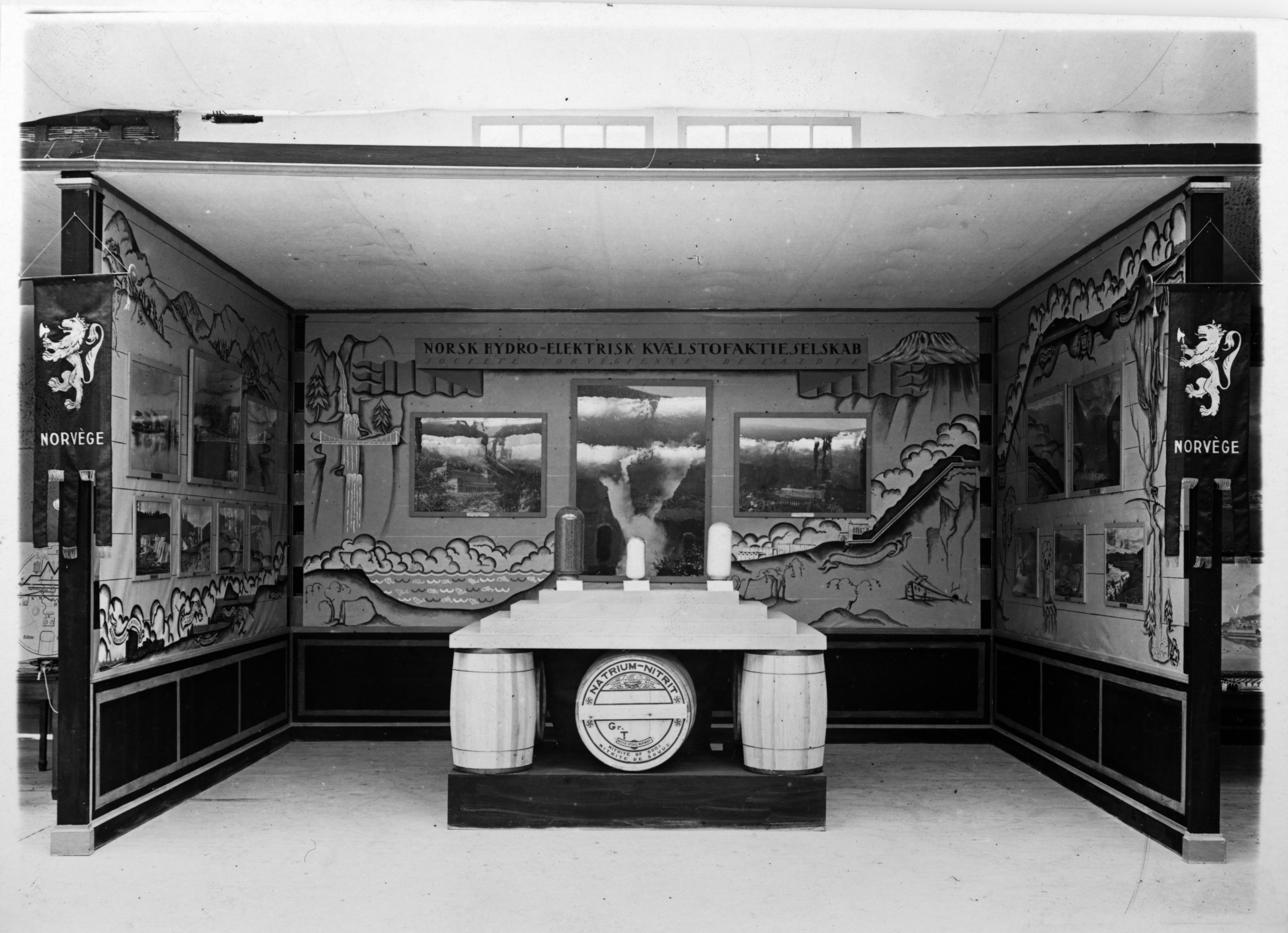 Parti fra den norske hallen på utstillingen. Fra Norsk Hydro - elektrisk kvælstofaktieselskab. Bannere med den norske løven på hver side.