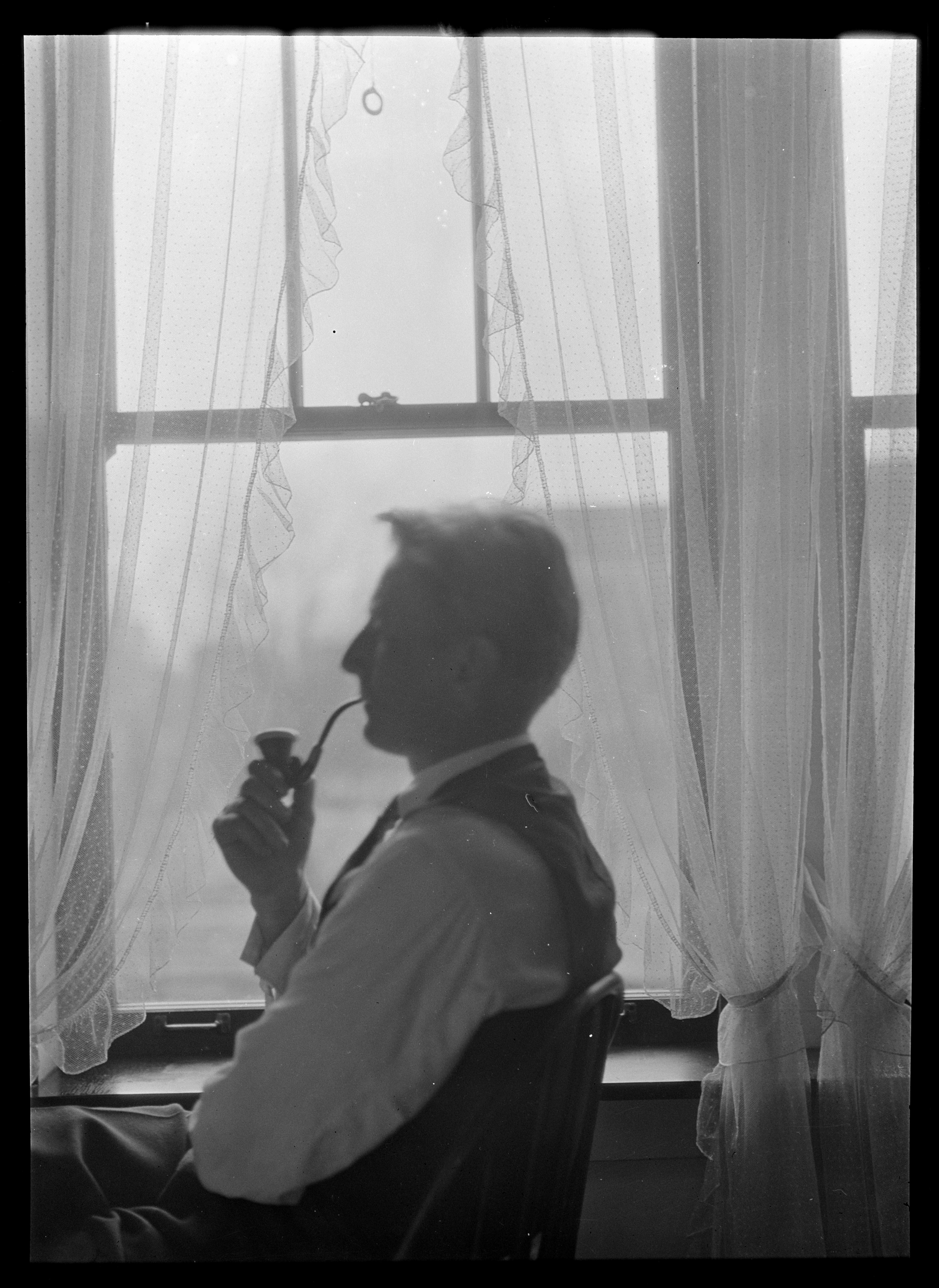 Roar sitter på en spisestuestol med en pipe foran vinduet med tyllgardiner.