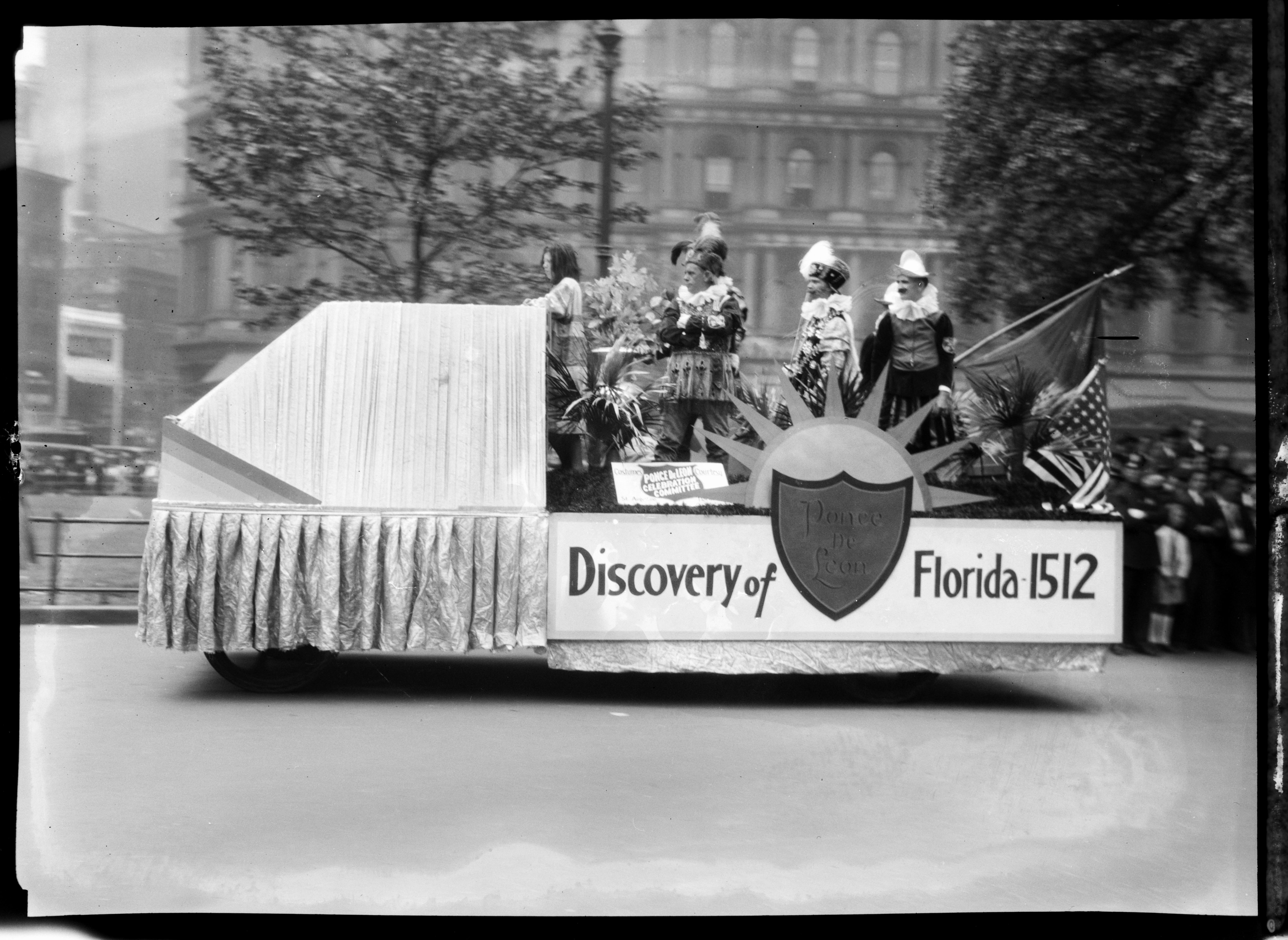 Opptog i New York foran City Hall Post Office and Courthouse. Flere utkledde menn på ei vogn med påskriften Discovery of Florida 1512 og et våpenskjold med Ponce de Leon.
