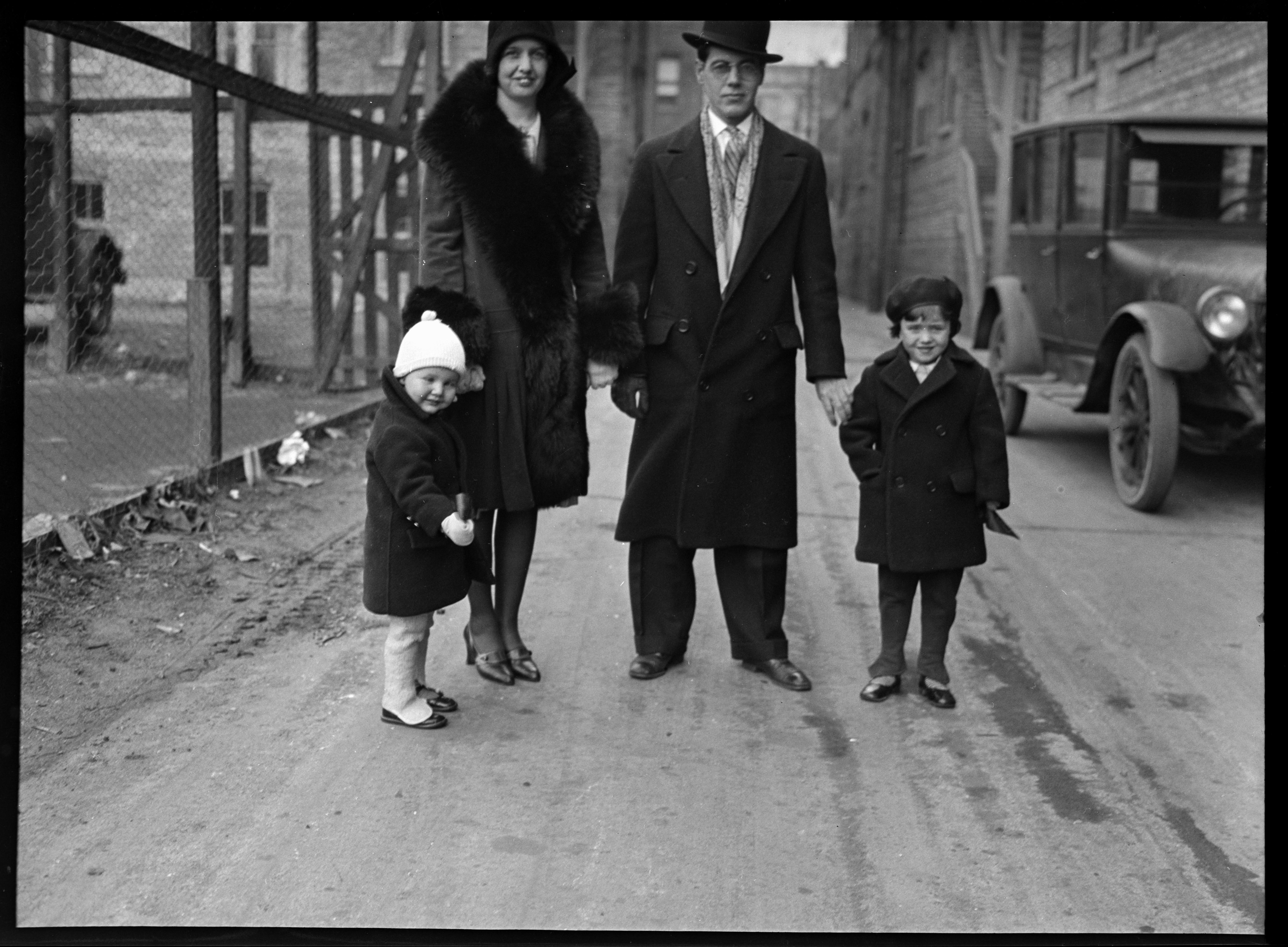 Mann, kone og 2 små barn står ute i en gate i Chicago.
