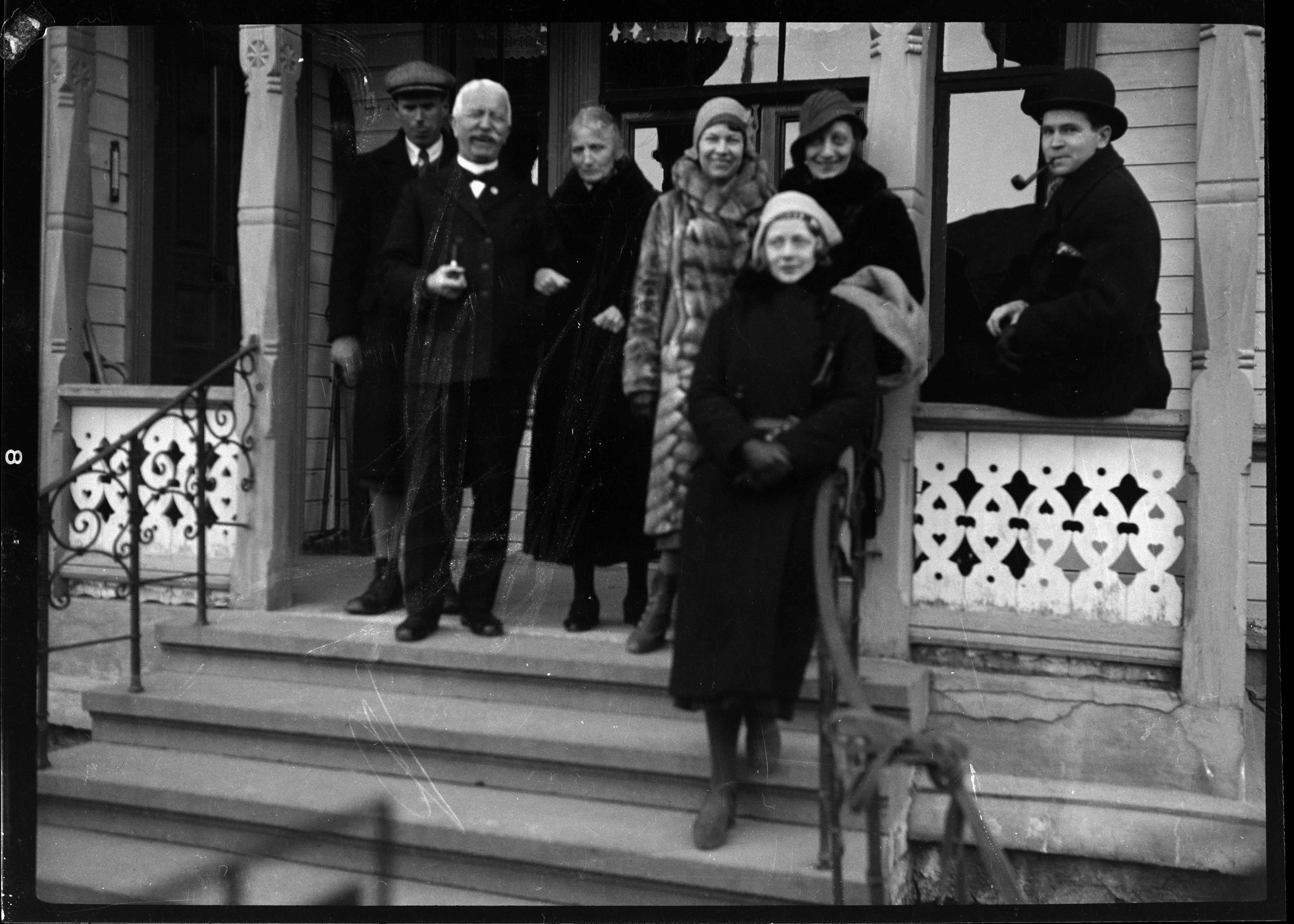 Ingrid står sammen med flere på personer ute på trappa foran inngangspartiet til Vinje bruket i Mosviken.