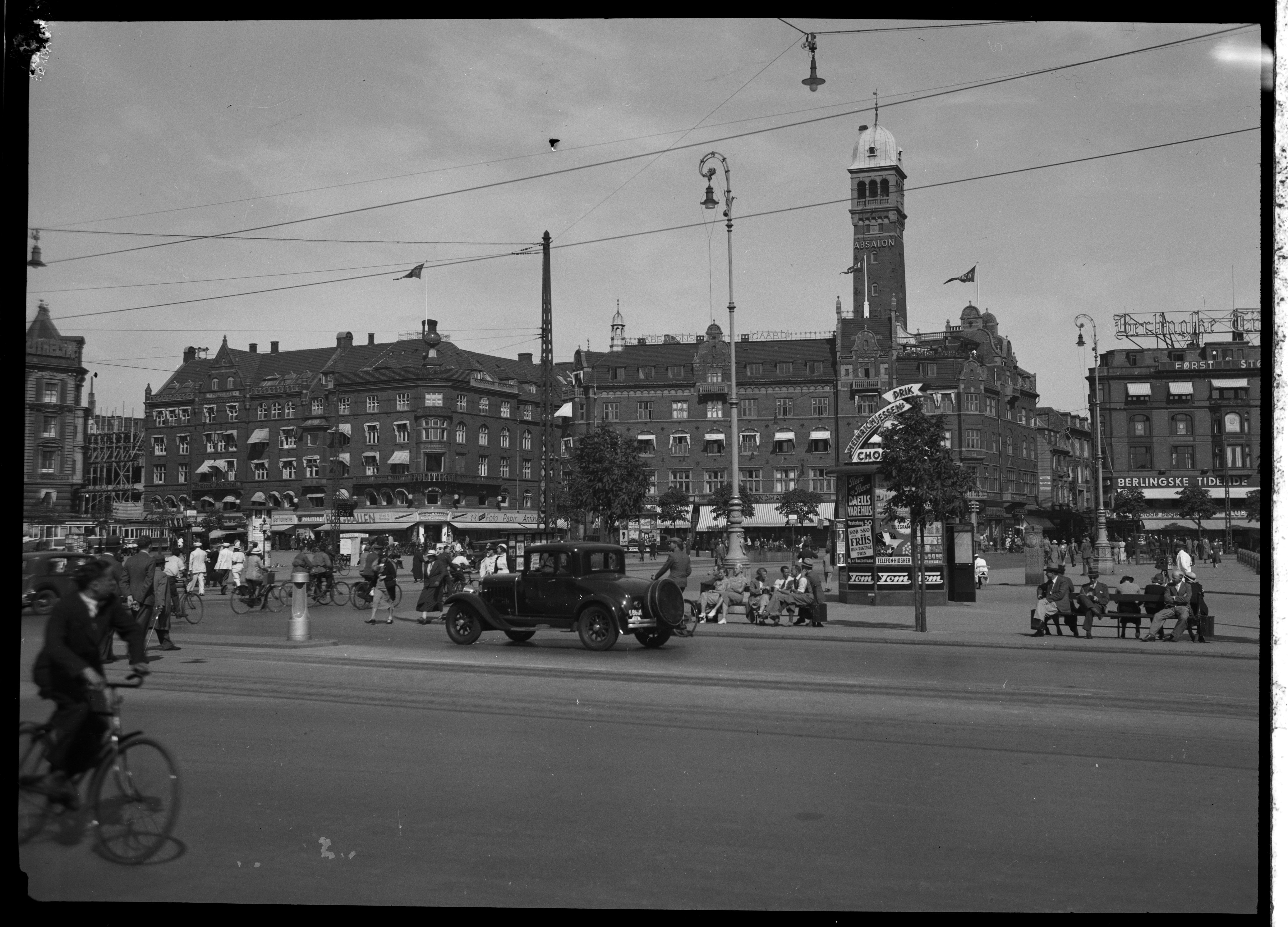 Liv og røre på Rådhuspladsen i København. Til venstre avisa Politiken og til høyre Berlingske Tidende. Midt på bildet den Absalonske Gaard.