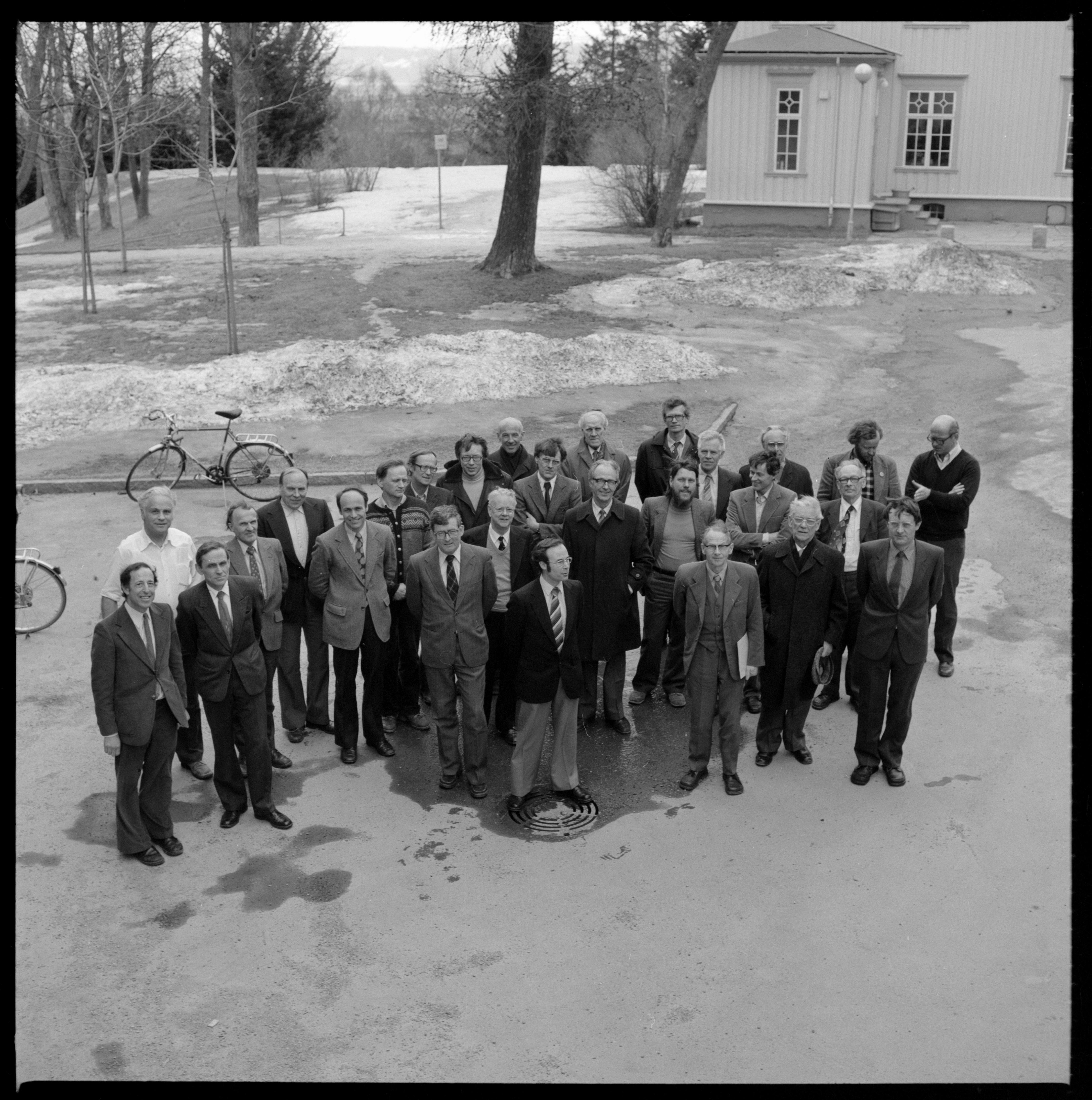 Fysikere ca. 1980. Daværende lokaler for daværende Inst. for teoretisk fysikk (den gamle døveskolen på Gløshaugen) skimtes i bakgrunnen.