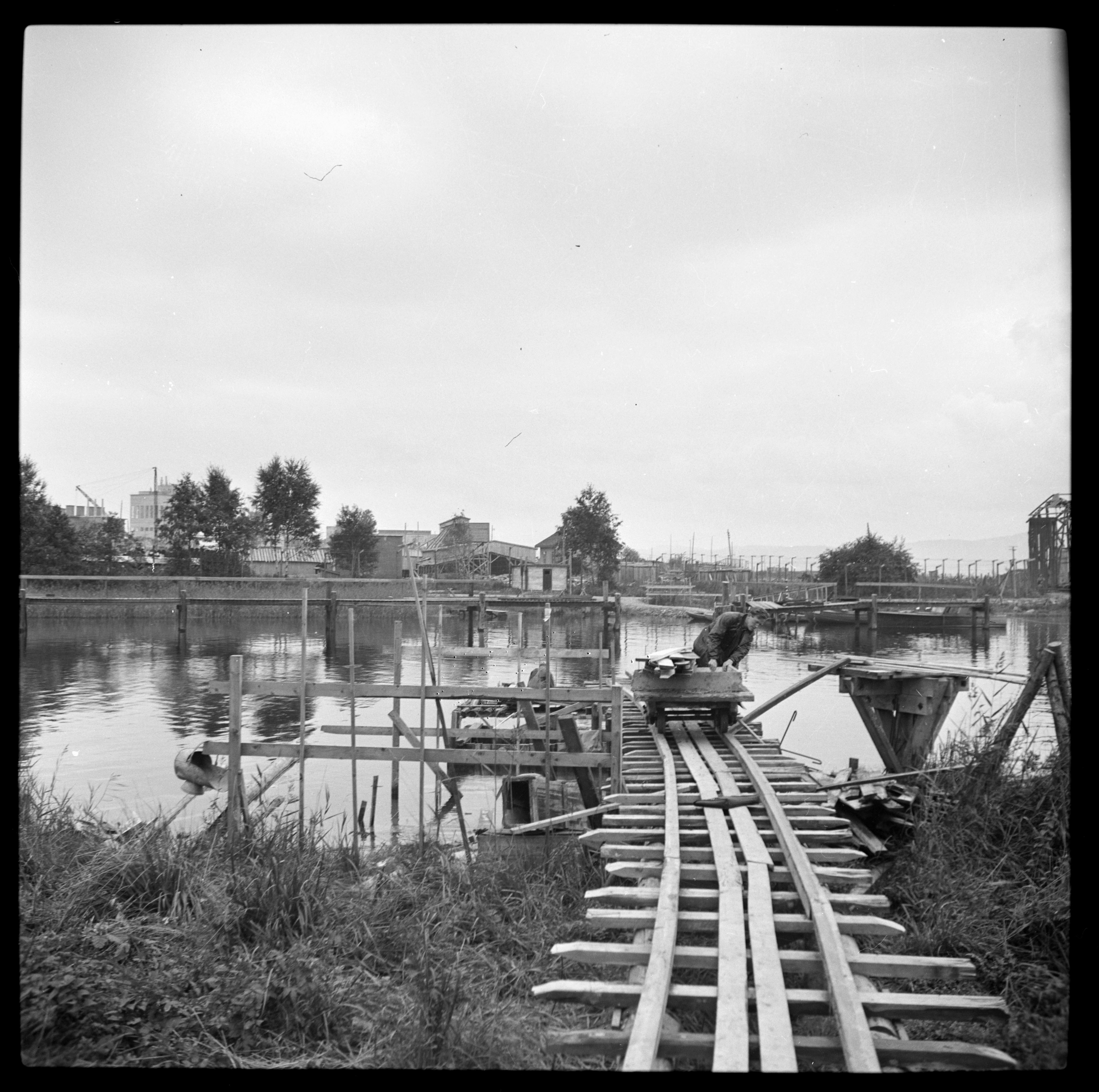 Mann står ved ei tralle med materiale på en bane av tre. Mye reisverk rundt om. En mann sees på ei flåte ved siden. På den andre siden av elven et industriområde.