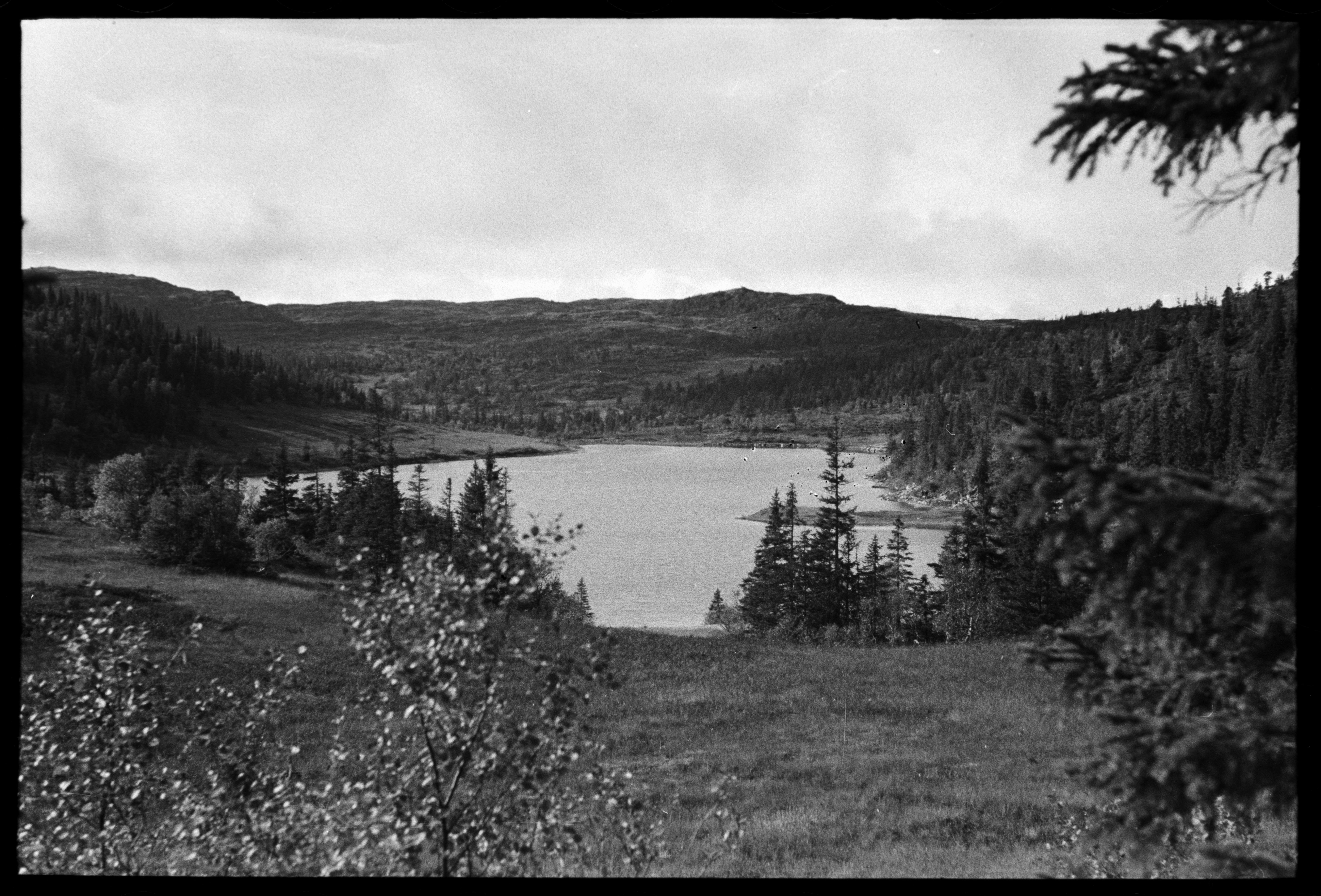 Utsikt mot Vintervatnet i Bymarka, med skogkledde åser omkring.