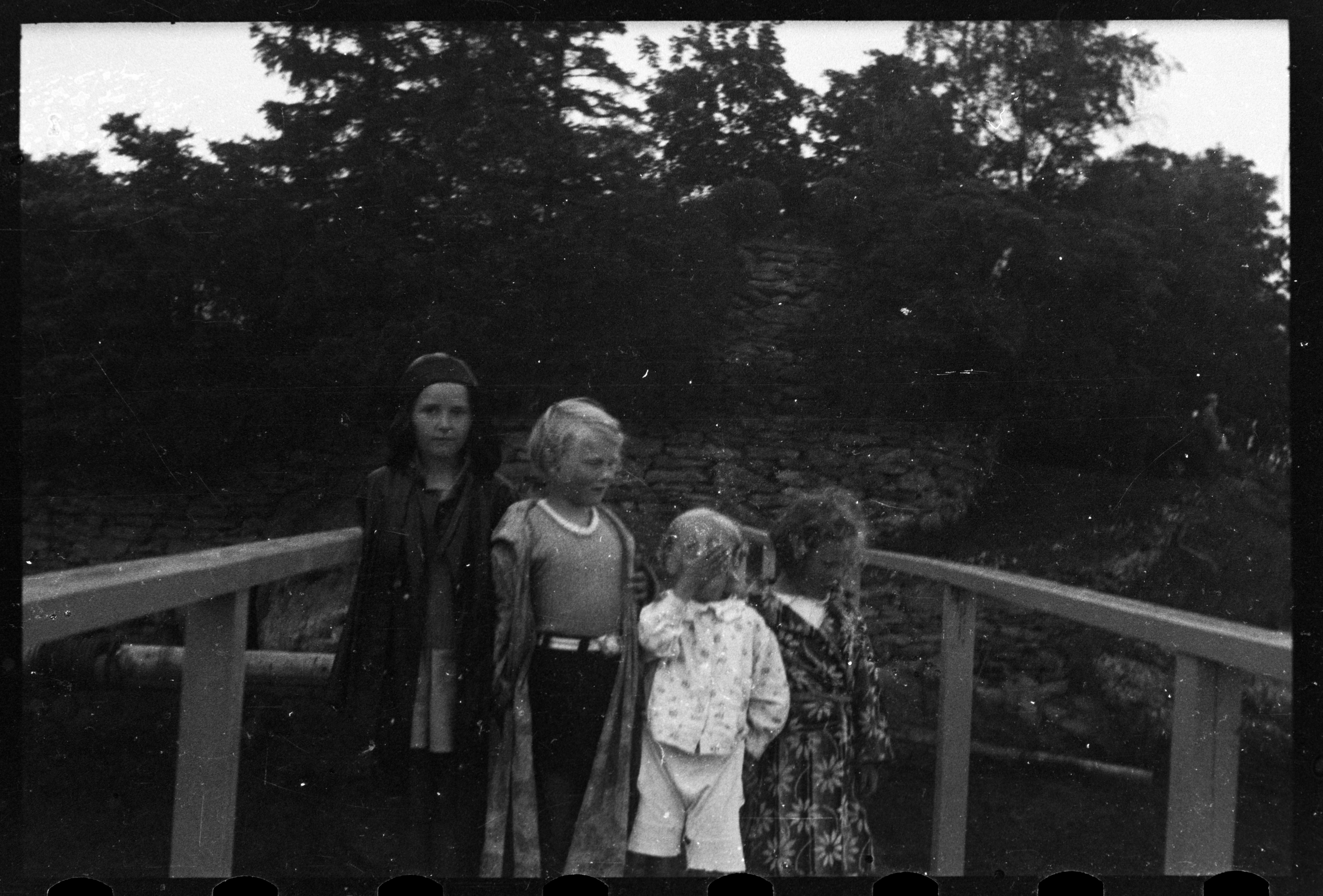 Jannicke, Wencke og søskenbarnet Grete sammen med ei venninne ute på badebrygga på Smedstuen.