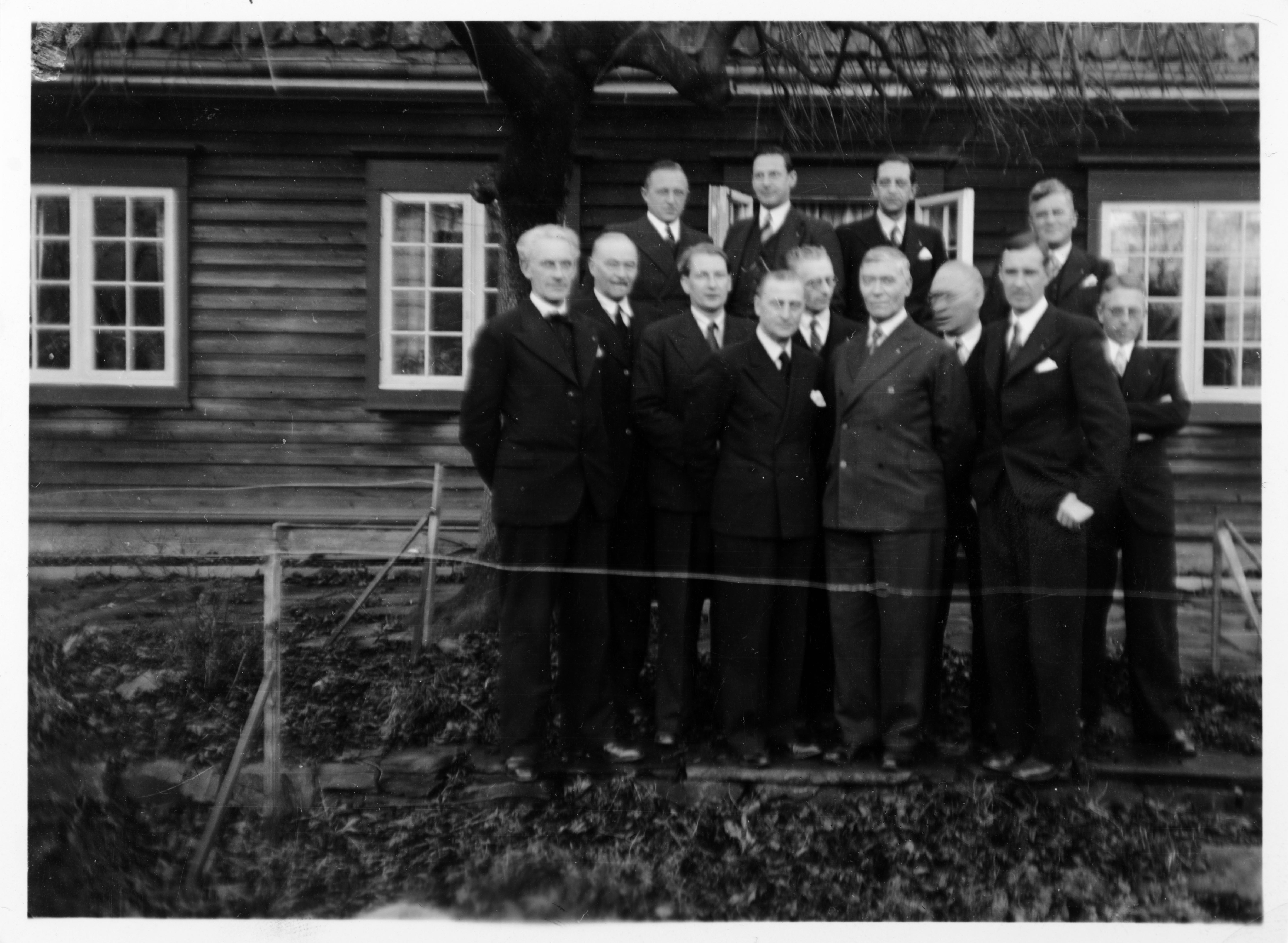 Roar står sammen med muligens kollegaer ute på tunet foran et lavt tømmerhus.