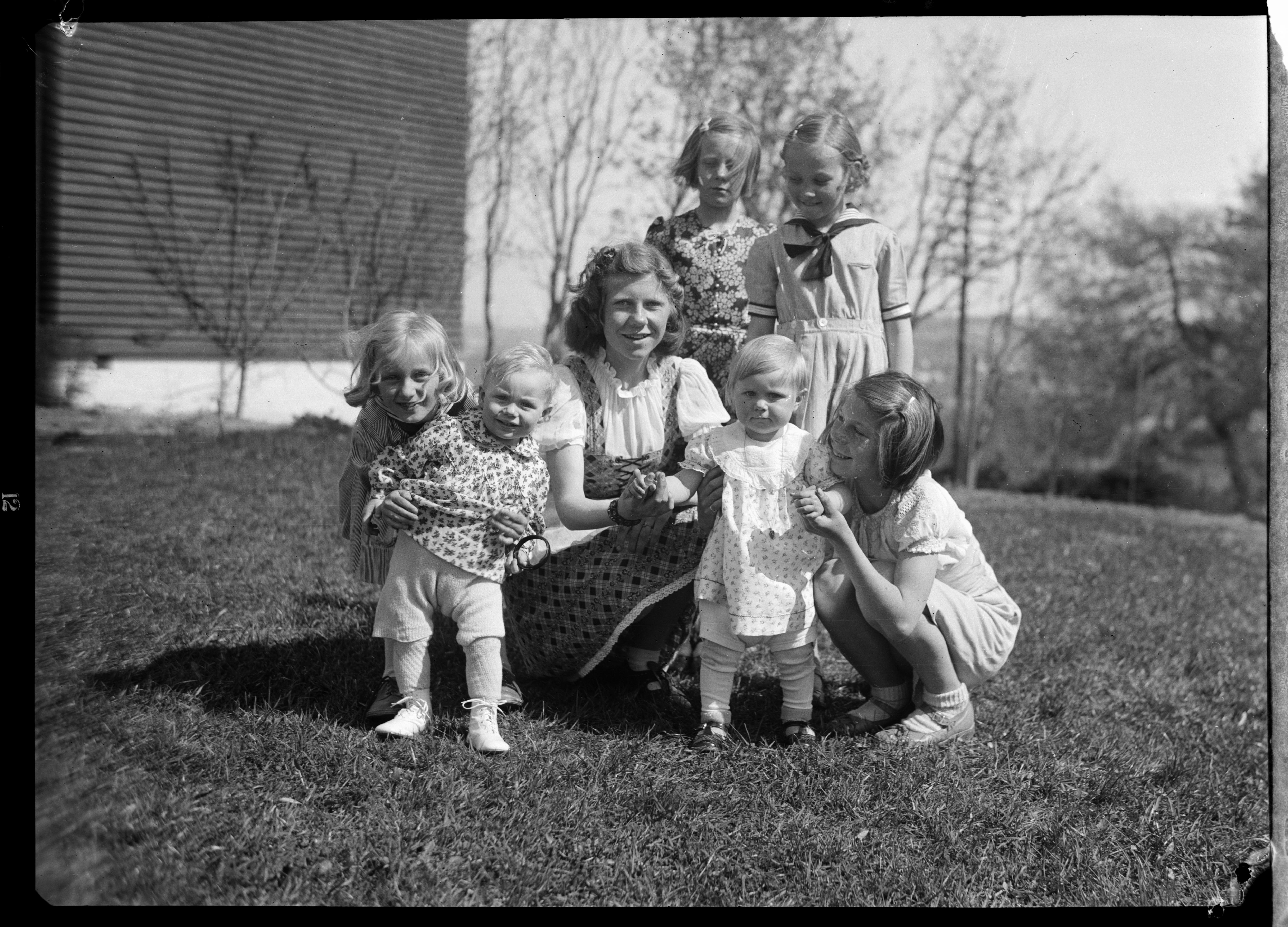 Døtrene Thiis og Knudtzon ute på plen foran Villa Rogne sammen med Grete Thiis.