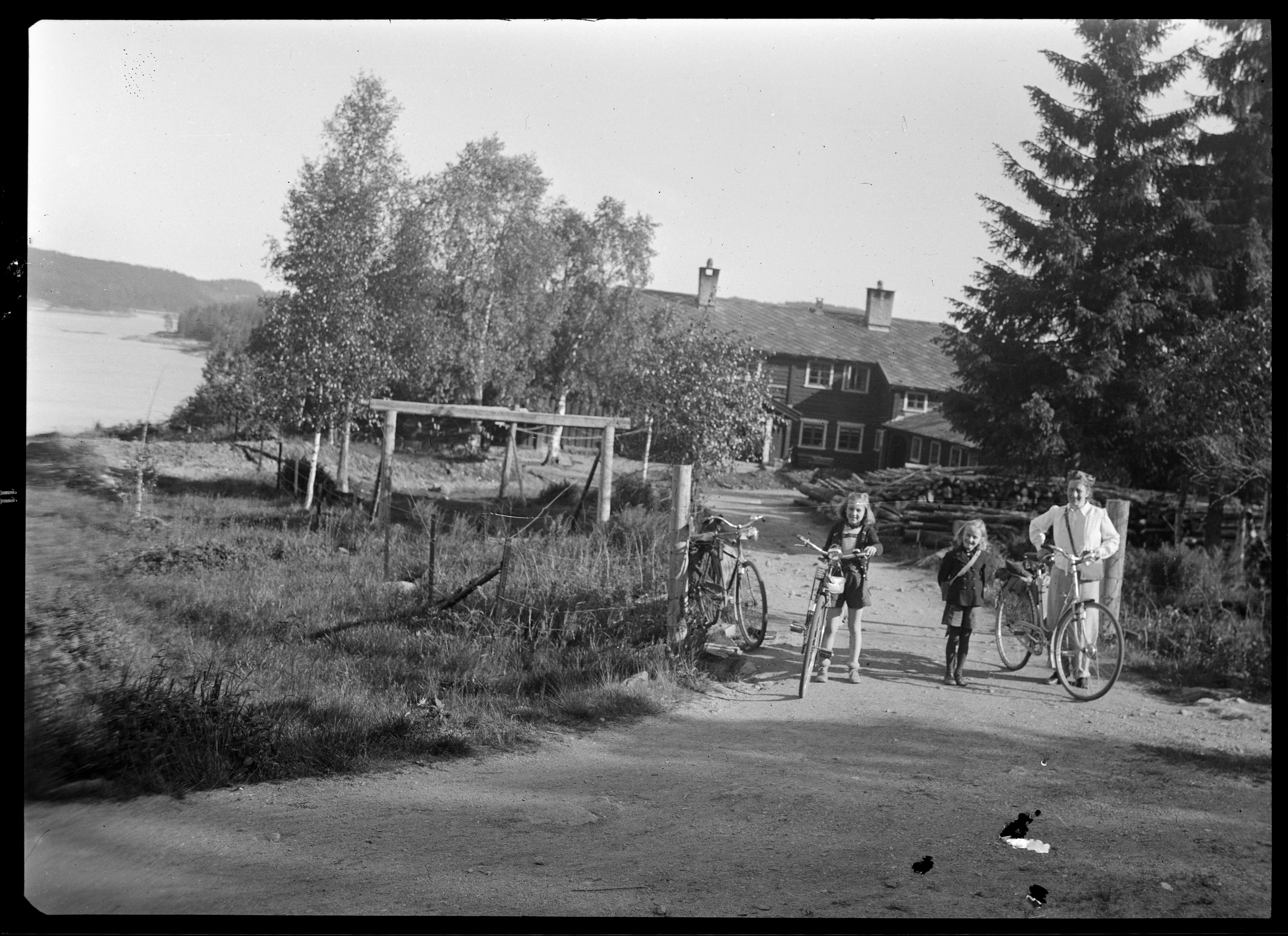 Ingrid med sykkel står sammen med døtrene Jannicke med sykkel og Wencke på Kikut. Herresykkel lent opp mot en gjerdestolpe.