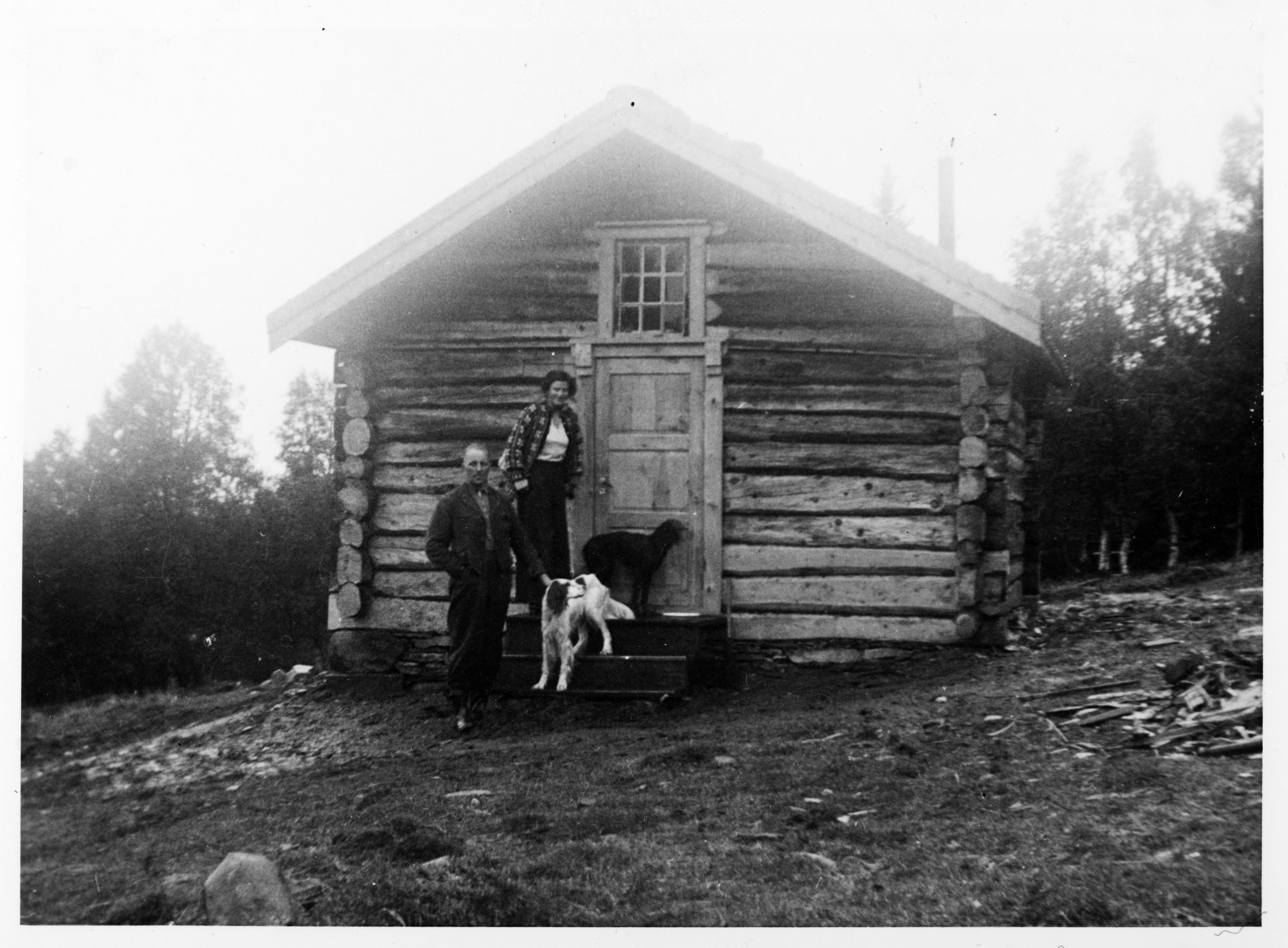 Muligens Harald og Reidun med hundene utenfor jakthytta ved Ramsjøen i Rennebu.