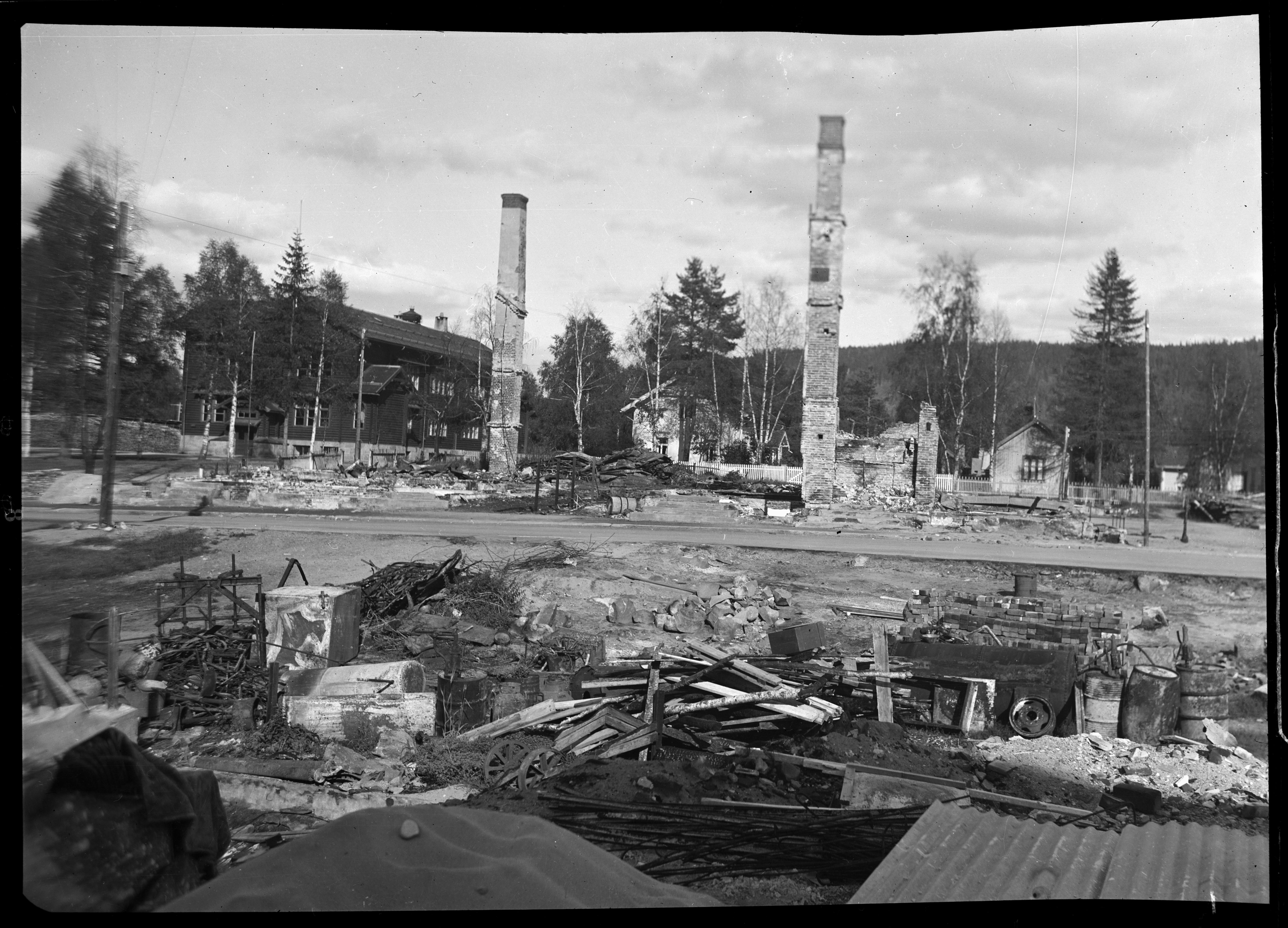 Sentrum av Rena etter 2. verdenskrig, brannruiner. Det store mørke bygget til venstre i bildet er Rena folke- og middelskole, tegnet av Henrik Bull i 1905.