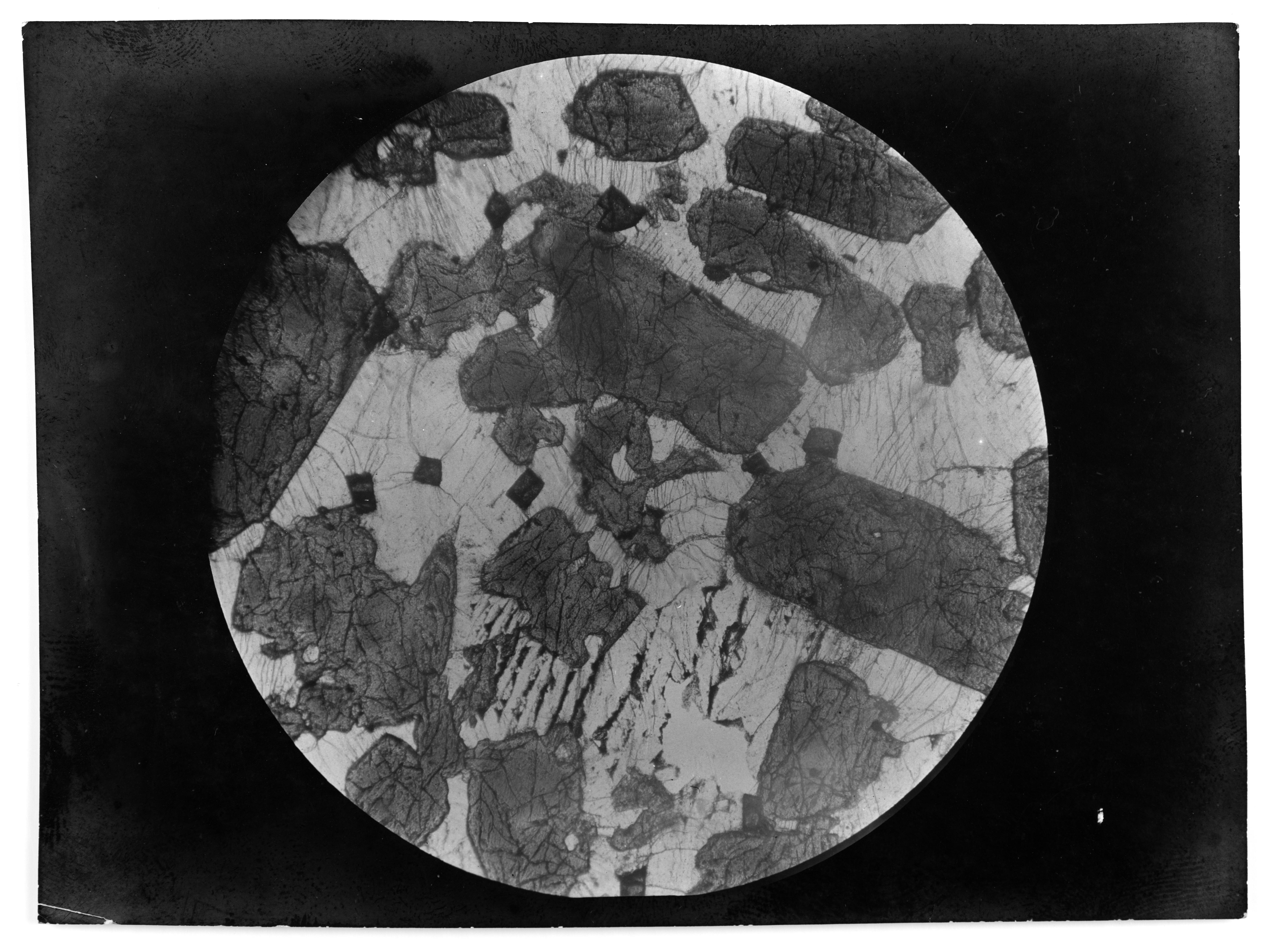 Eskenummer 41, glassnegativer. Påskrevet indre eske: Nr. 135. Bildeinformasjon: Grundmassen bestaar av plagioklas. De store krystaller er ..tit? (lysegrøn-lysebrun). De smaa kvadrater med sterkt relief er tversnit av fergusonit. (brun).