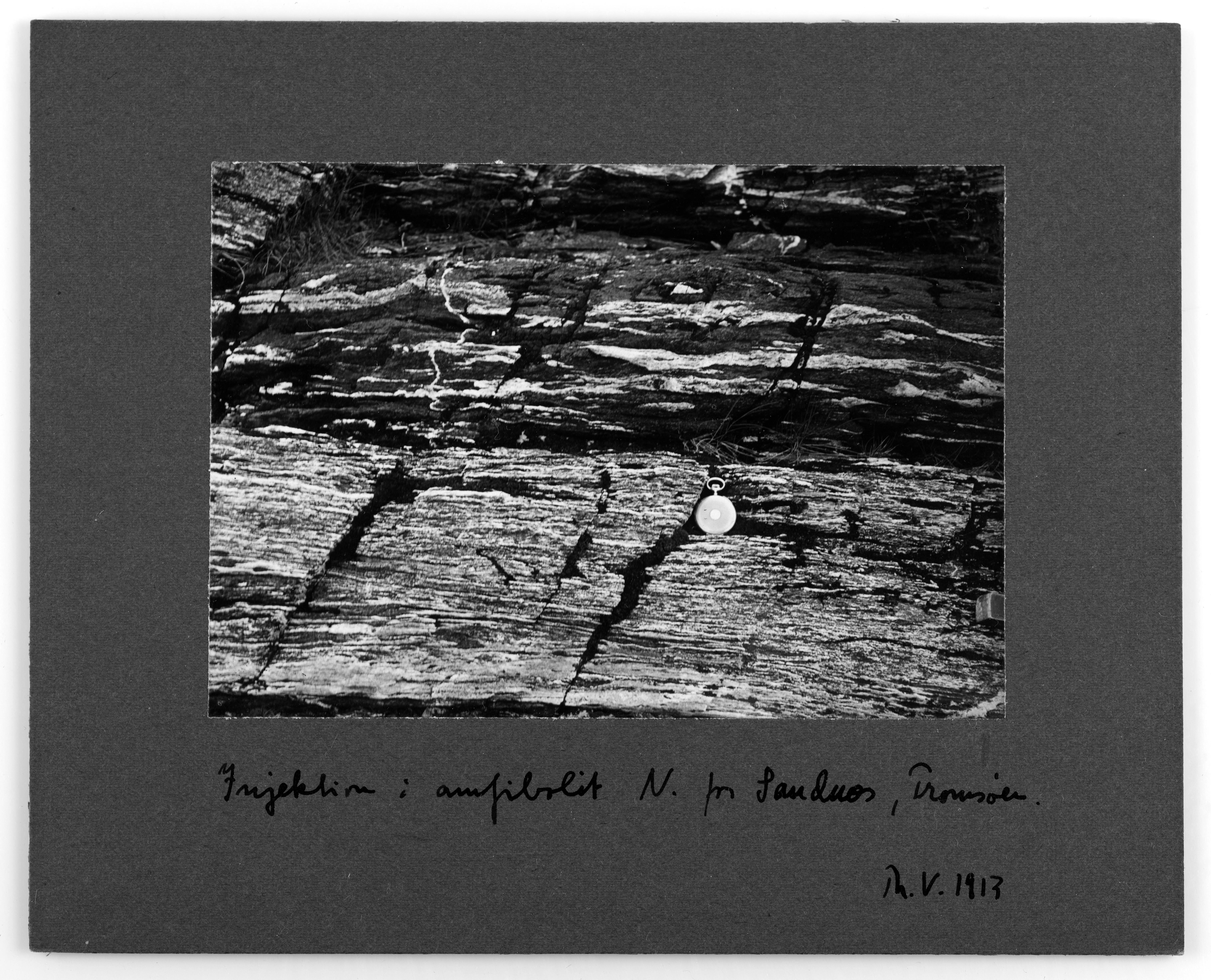 Eskenummer 42, glassnegativer. Påskrevet indre eske: Nr. 143 14 stk fotografier Th. Vogt 1913. Bildeinformasjon: Injektion i amfibolit N. for Sandnæs, Tromsøen. Th. V. 1913.