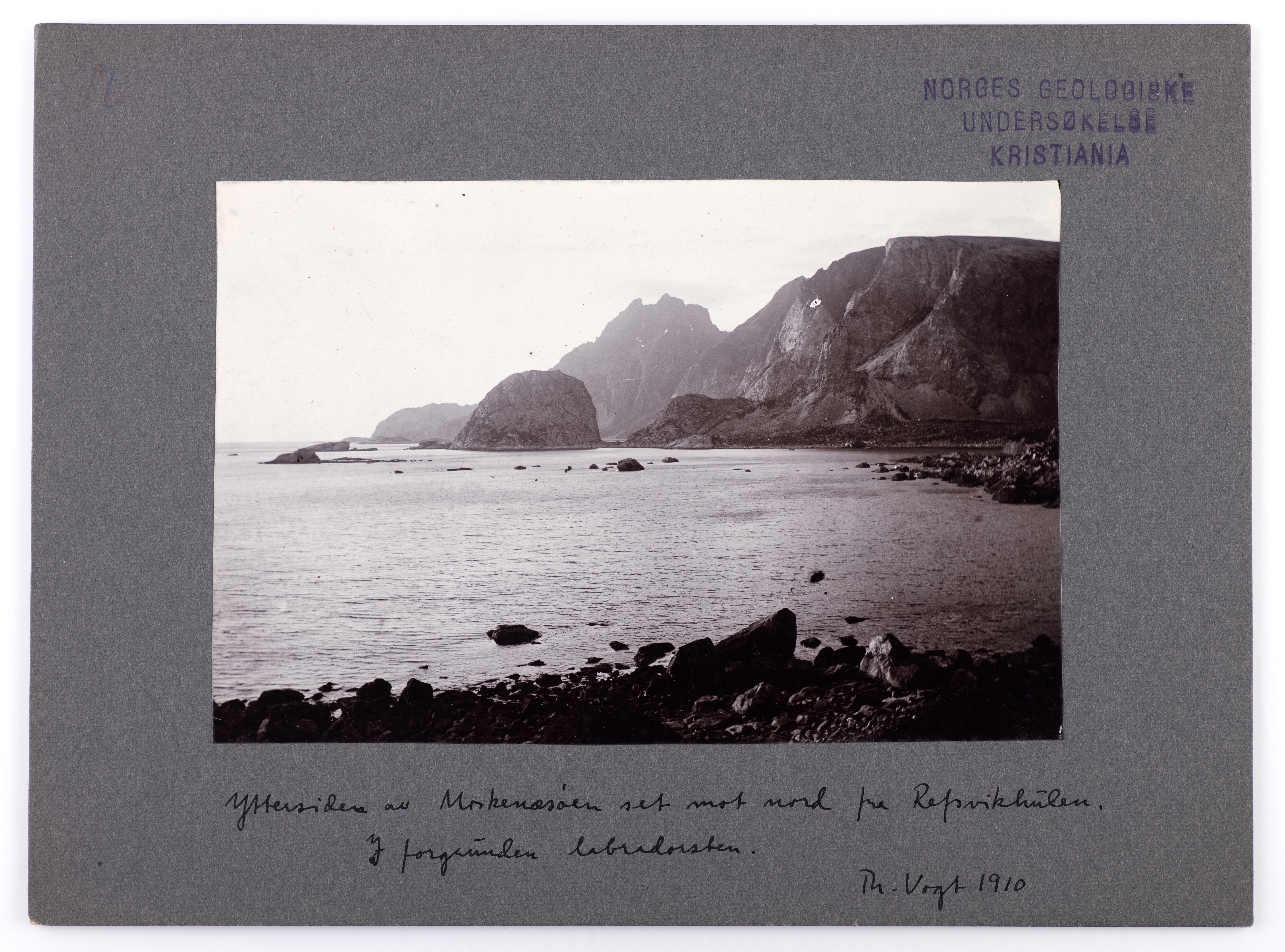 Påskrevet ytre eske: Eske 44 Glassnegativer. Monterte kopier av stereofilmer. Oppklebete fotografier. Bildeinformasjon: Yttersiden av Moskenæsøen set mot nord fra Refsvikhulen. I forgrunden labradorsten. Th. Vogt 1910. Norges Geologiske Undersøkelse Kristiania.