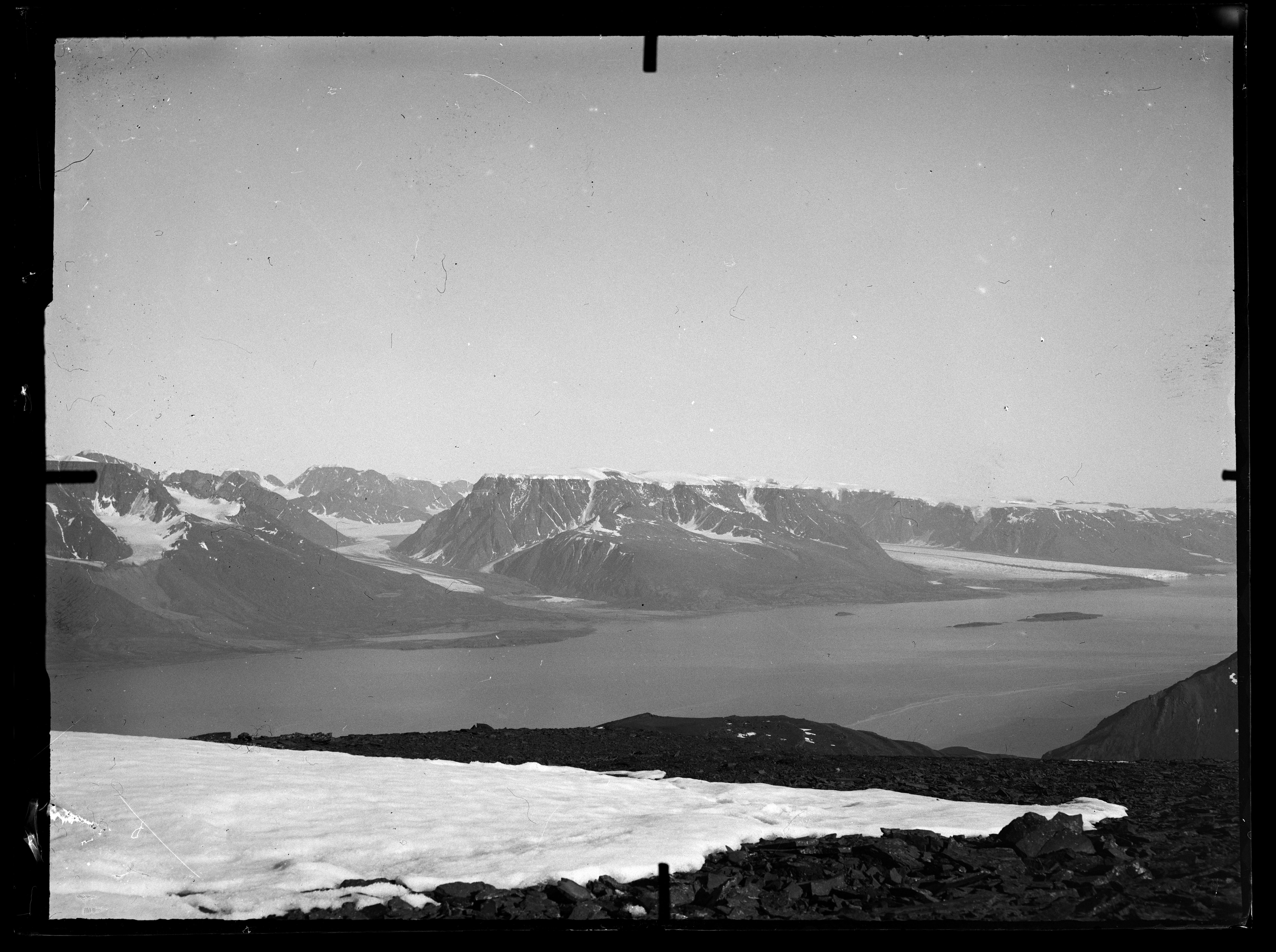 Påskrevet ytre eske: Eske 45 Glassnegativer. Påskrevet indre eske: Spitsbergen 1928 Panorama Grå kammen VIII.