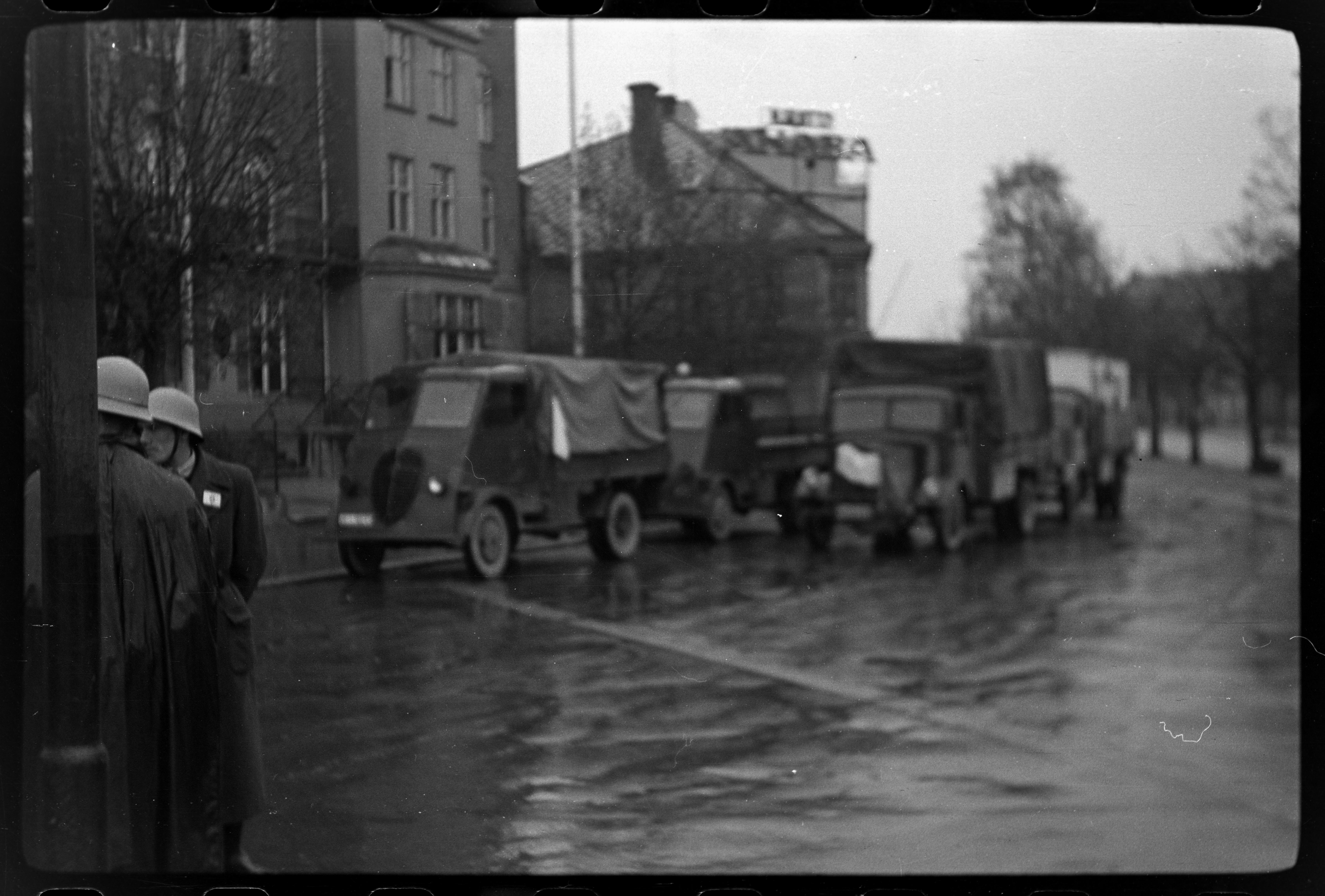 Militære kjøretøy parkerts utenfor hotel Phoenix. Menn fra Hjelpekorpset foran til venstre. Bygninger nedover Munkegata i bakkant med trerekka ved fortauskanten.