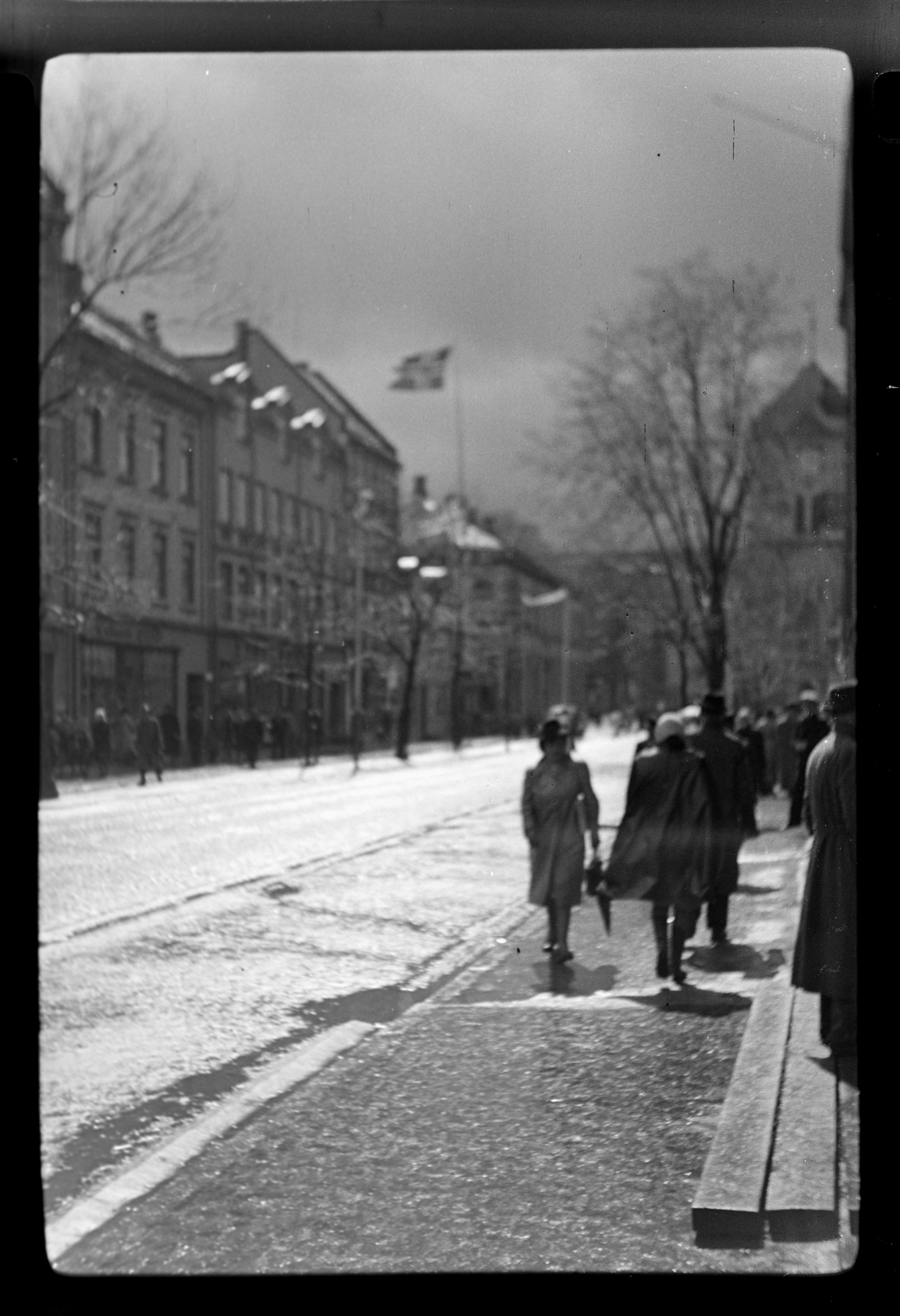 Parti fra Nordre gate oppover mot Vår Frues kirke. Det norske flagg vaier i vinden. Flere mennesker ute i gaten. Husrekka fra Telegrafen og nedover til Nordre gate 9 til venstre.