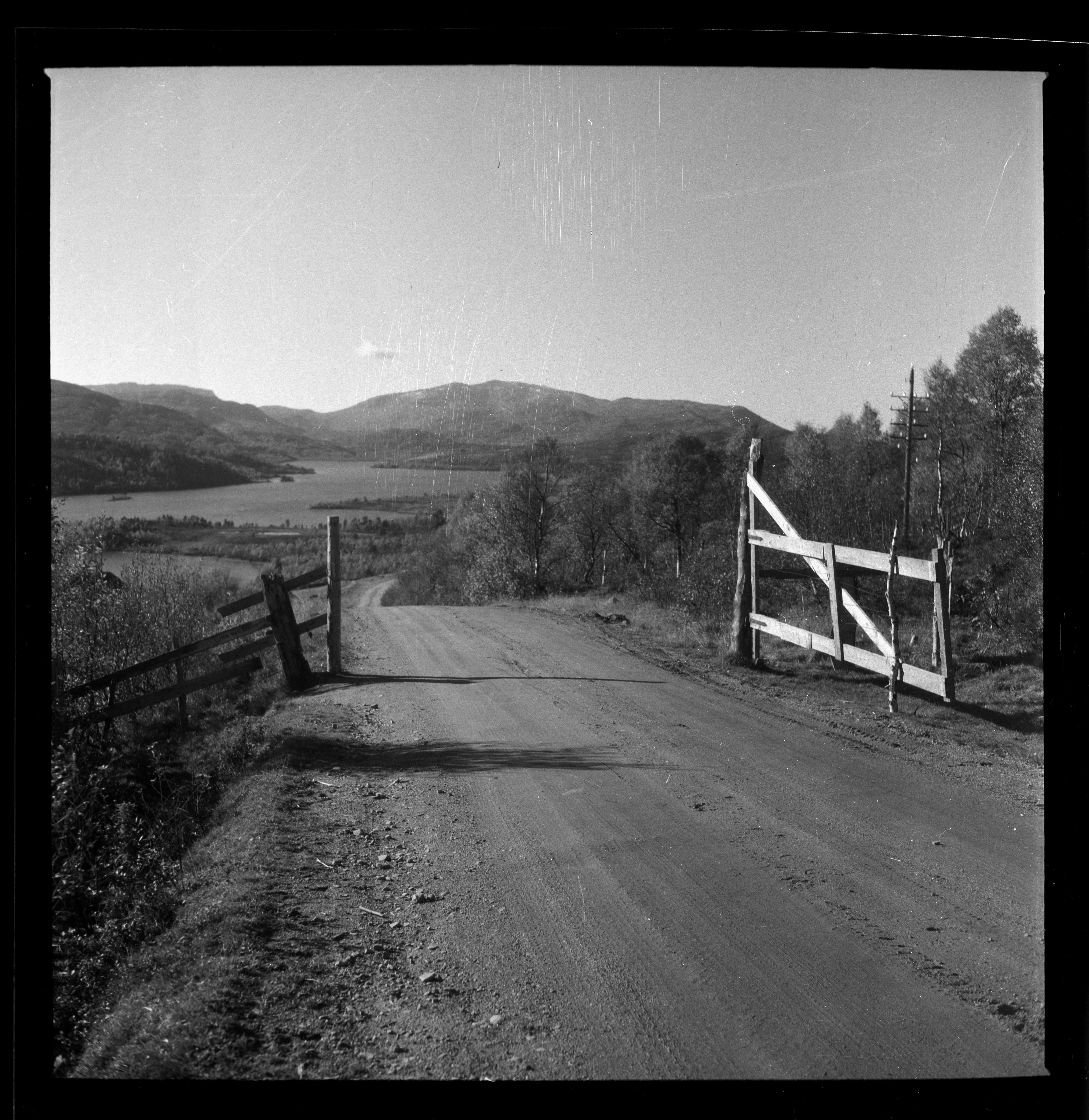 Åpen grind på grusveien ved Slupphaugen på Søvassli. Søvatnet og fjellene vestover i bakkant.