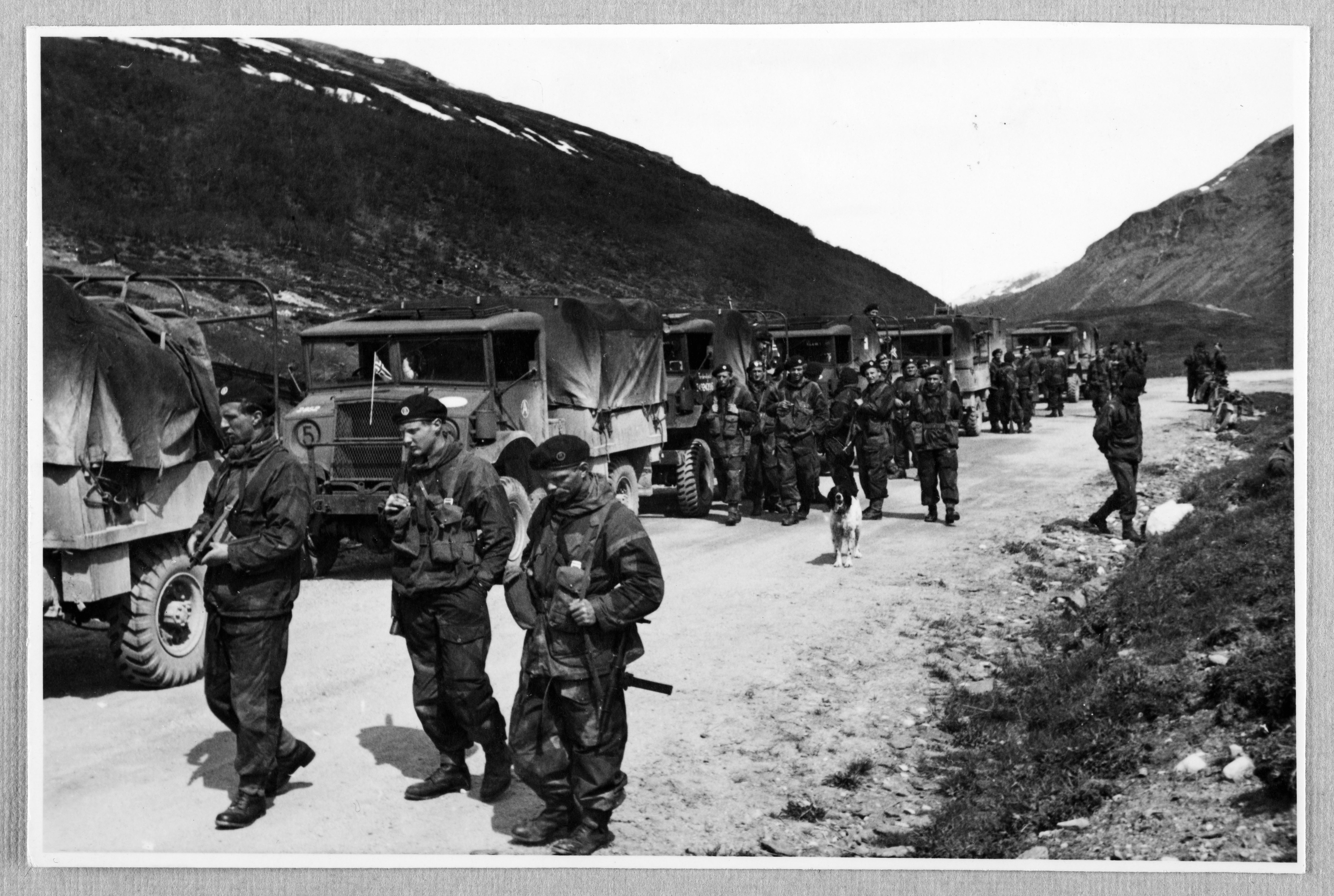 Fremst på bildet går 3 soldater i uniform alle med gevær. Bak dem kommer en hund foran flere soldater bakom. Til venstre på veien står militære kjøretøy parkert på veien i Drivdalen.