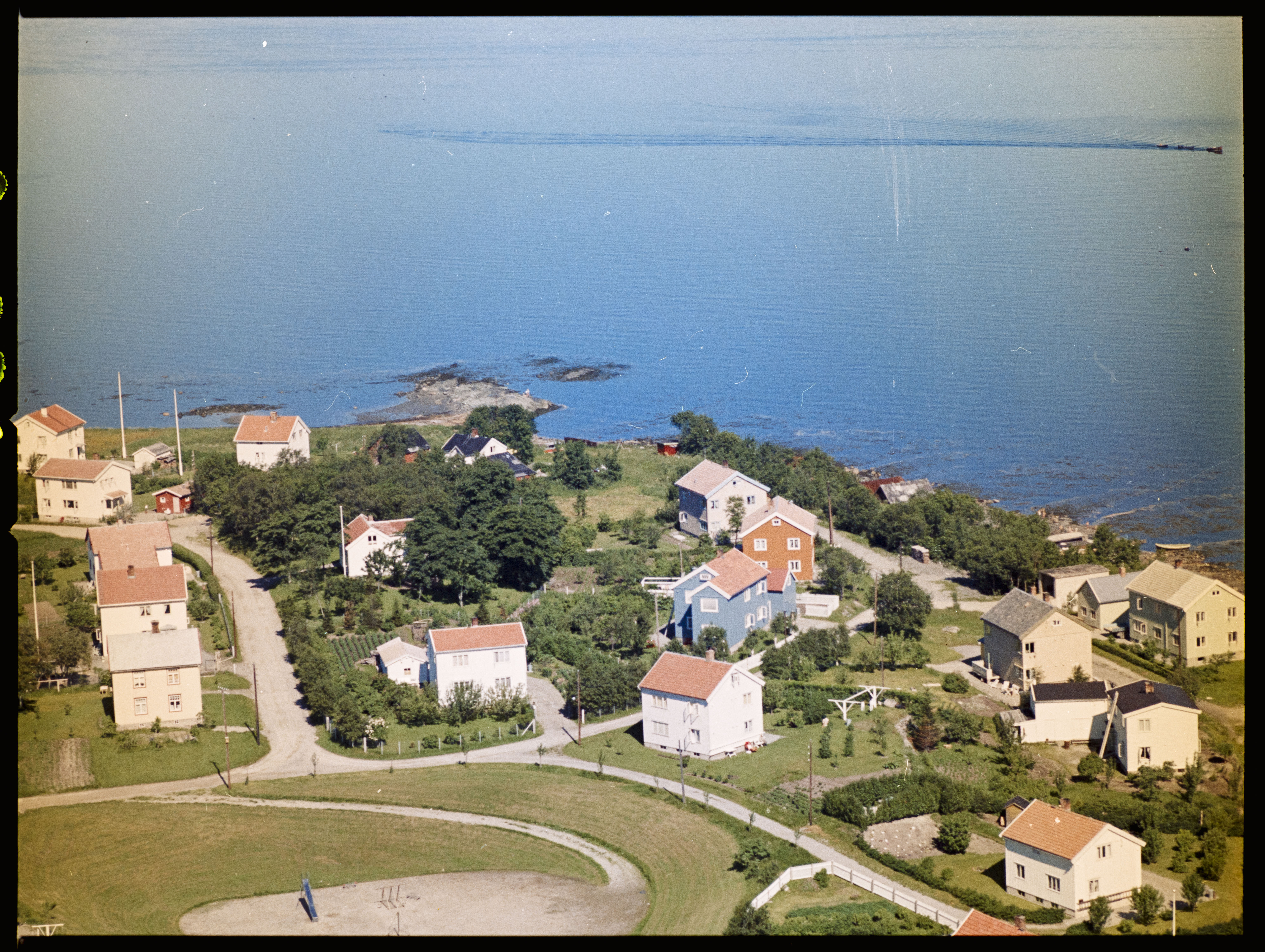 Bebyggelse rundt Vikavegen og Hitravegen ved Ranheimsfjæra, sett fra sør. Lekeplass nederst i bildet.