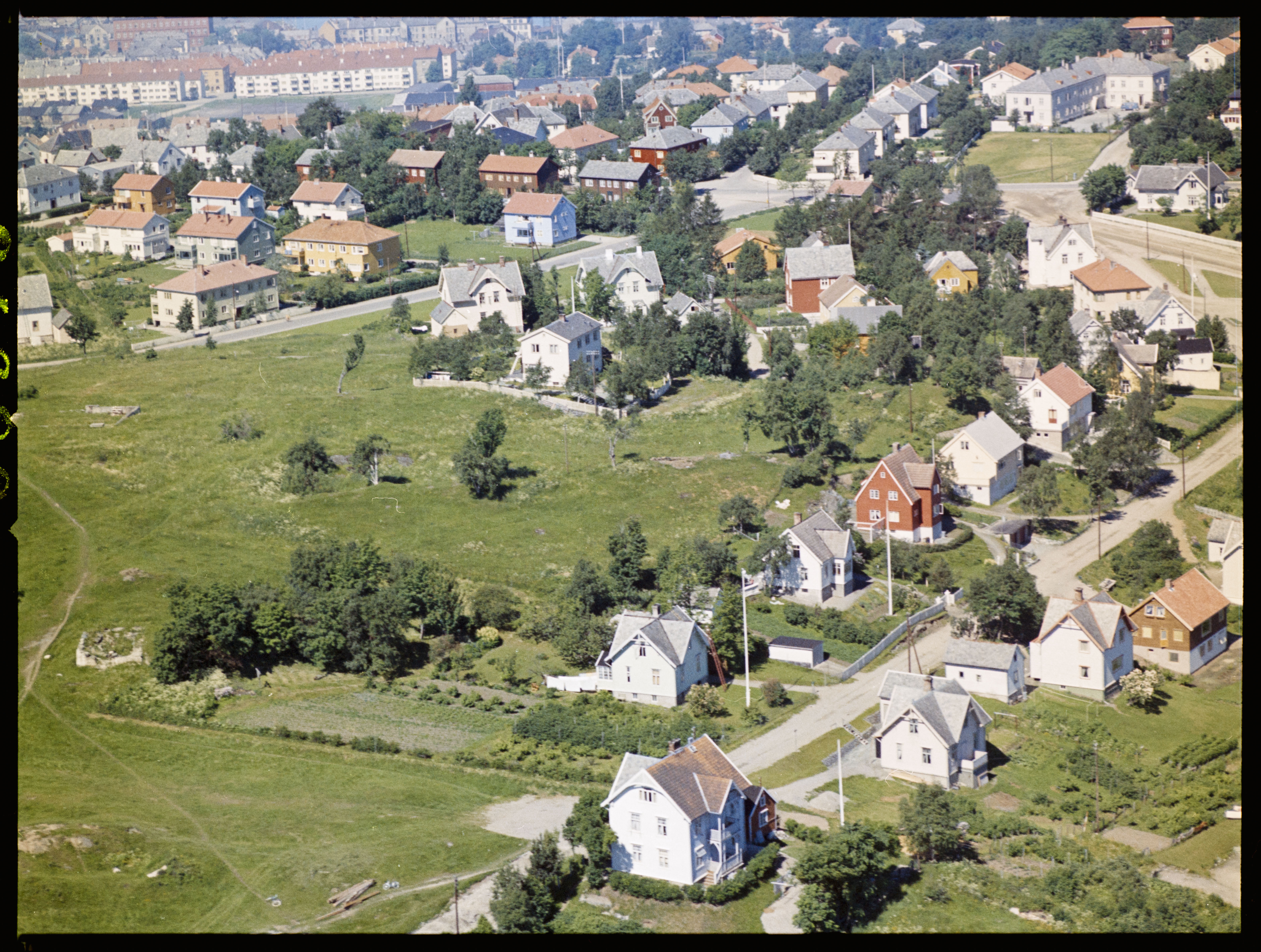 Foran ses Tankvegen med grøntarealer ved Skipsmodelltanken. Videre ses Tyholtveien og Asbjørnsens gate. Tyholt sykehus oppe i høyre bildekant.