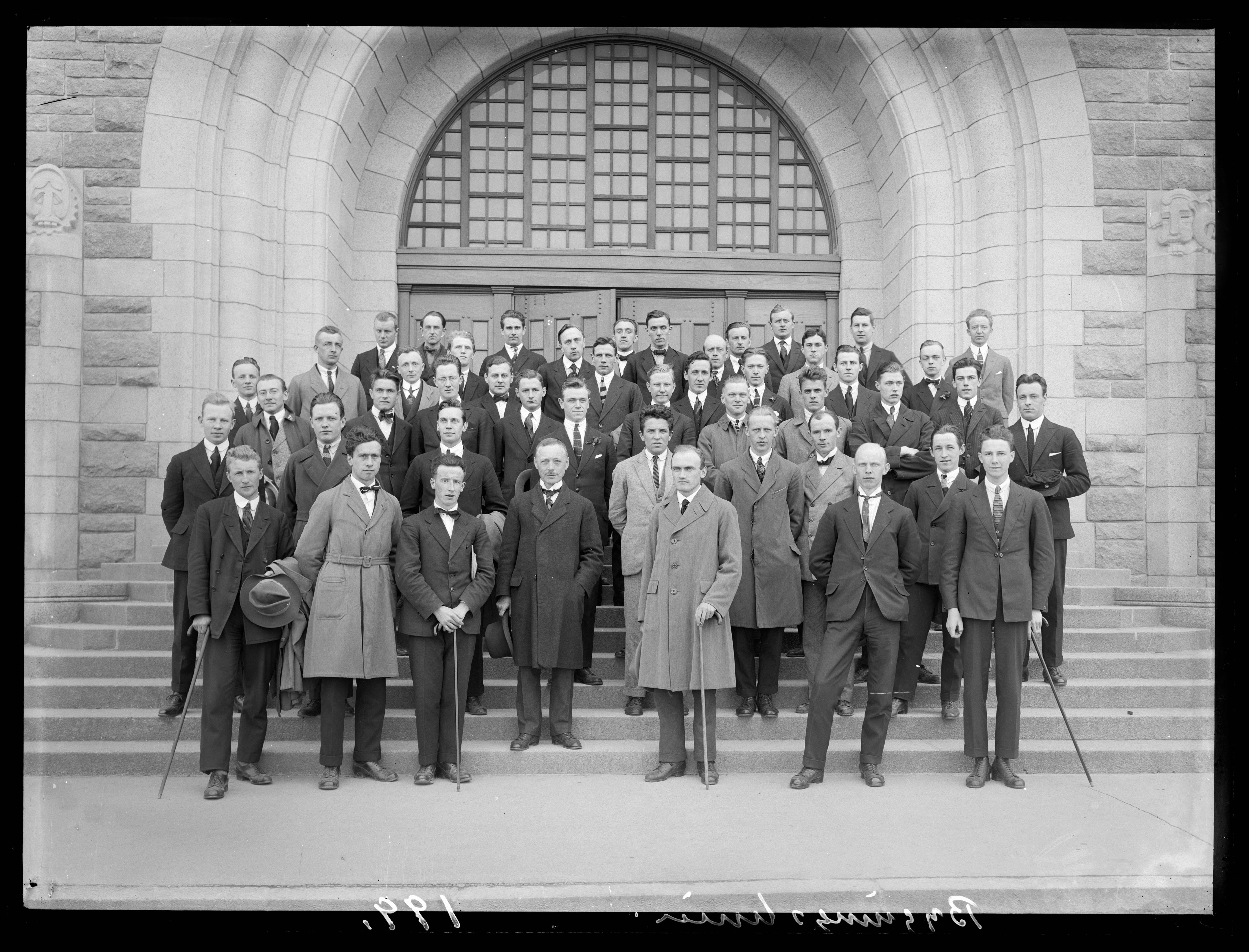 Professor Richard Birkeland på første rekke, nr. 4 fra venstre, med hatt i høyre hånd. Bildet er tatt på trappa foran Hovedbygningen på NTH, Gløshaugen.