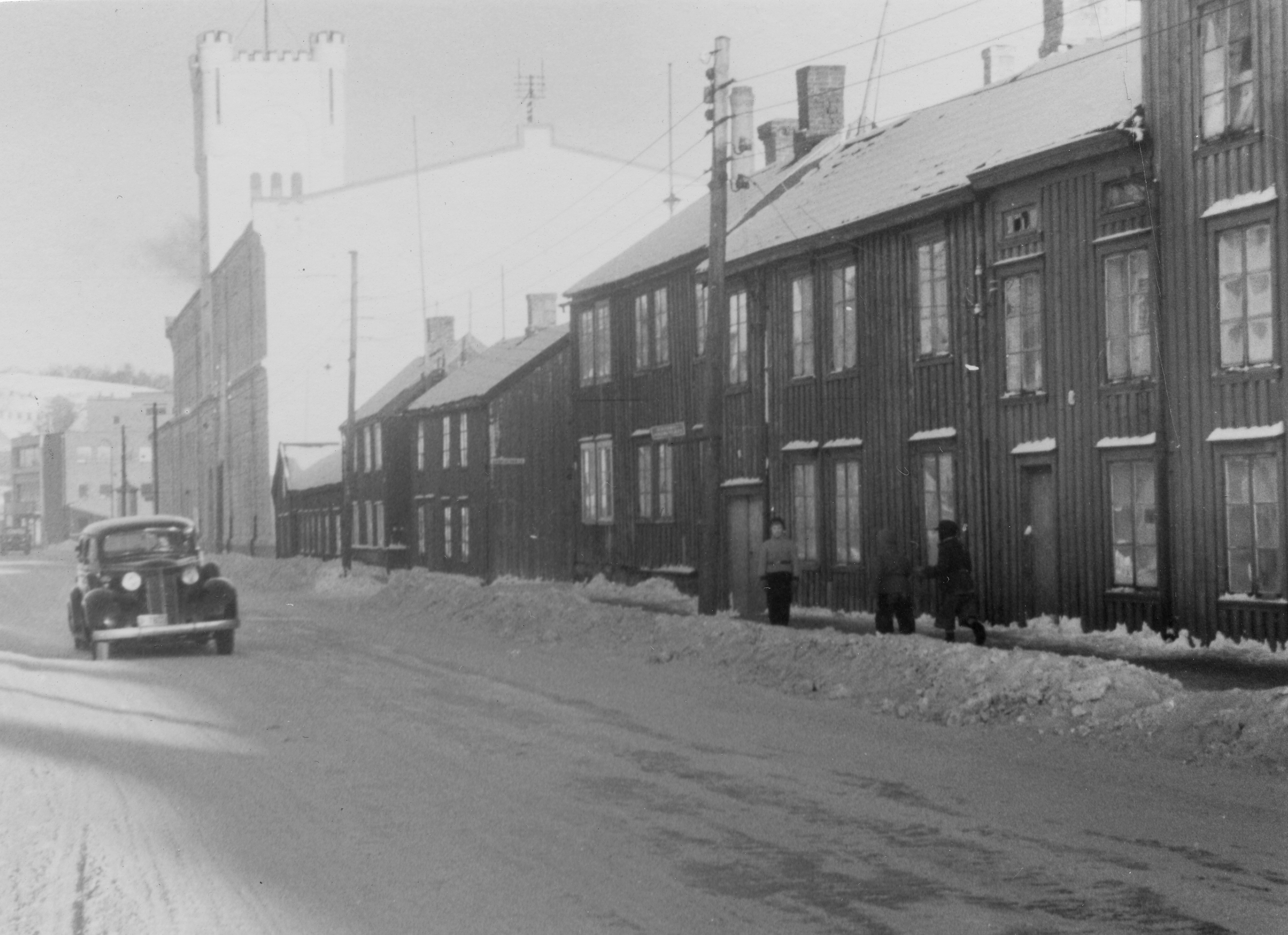 Strandveien, vinterbilde med bil i gata. Murhuset med tårn til venstre i bildet, er Strandveien 71, Aktiebryggeriet. Videre mot høyre, Strandveien 69, 67, 65, 63, 61 og 59 helt til høyre. Nr. 59 gikk under navnet Blåtårnet. Mellom nr. 63 og 65 gikk Suhms gate som senere skiftet navn til Arbeidergata. Bildet er tatt i forbindelse med Sverre Pedersen boligundersøkelse.