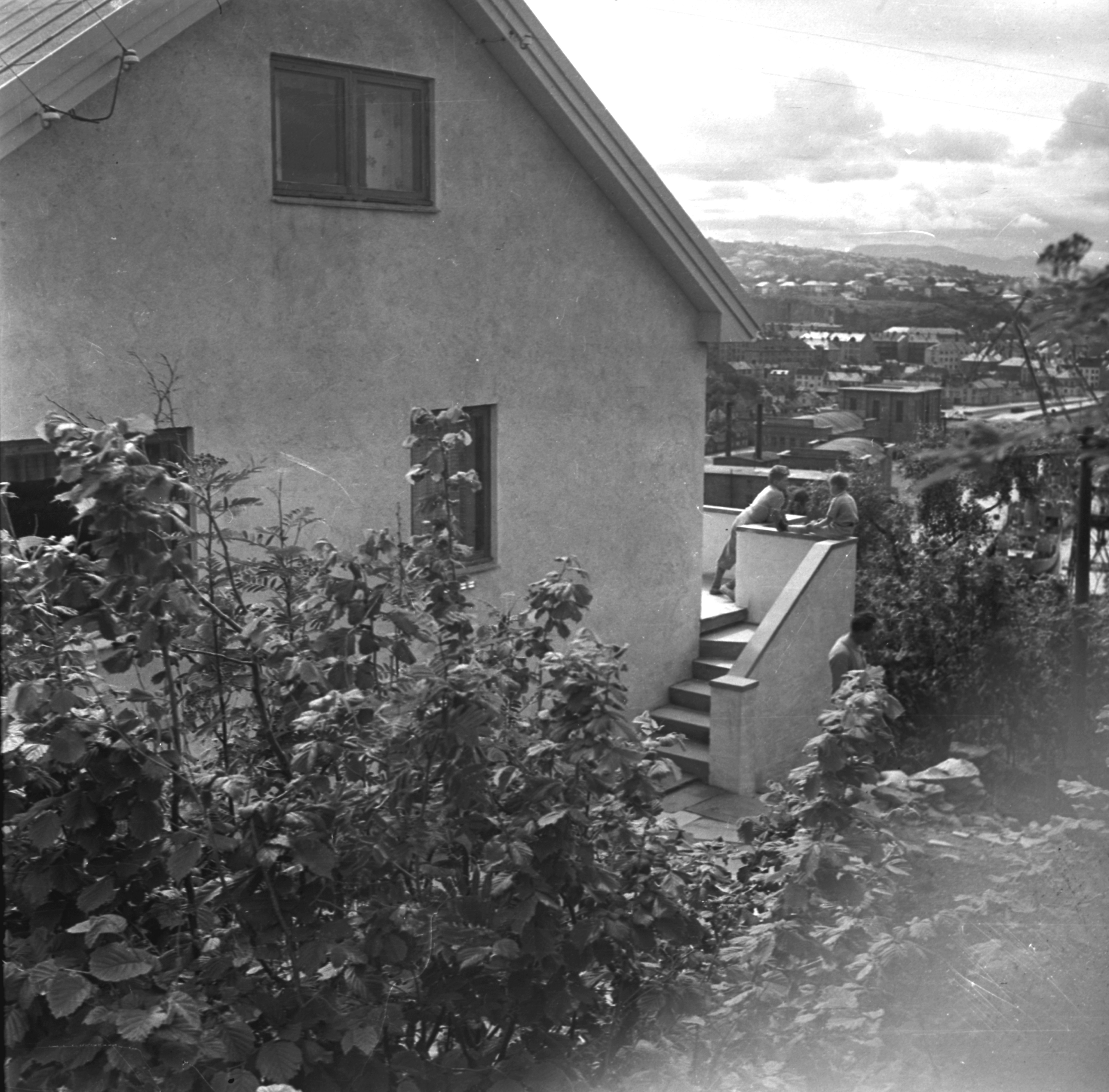 Bildet viser et bolighus på Ladehammeren på Lade, muligens Hammerstua. Villa, murbygning, busker, to barn på verandaen.