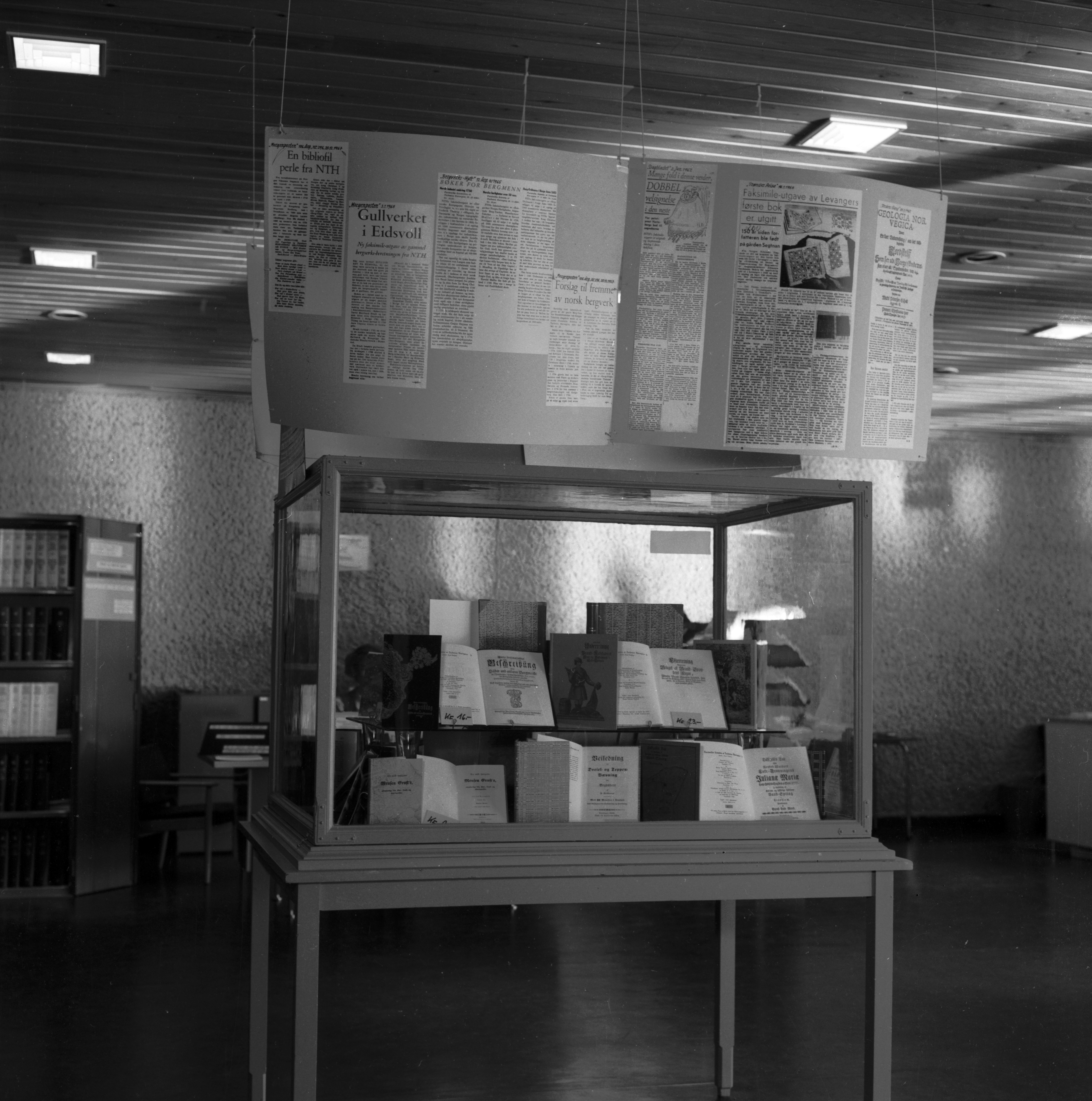 NTH-biblioteket. Vestibylen IT-bygget (sydfløy) ved auditorium F1. Trolig en midlertidig plassering for fremvisning/utstilling av litteratur.