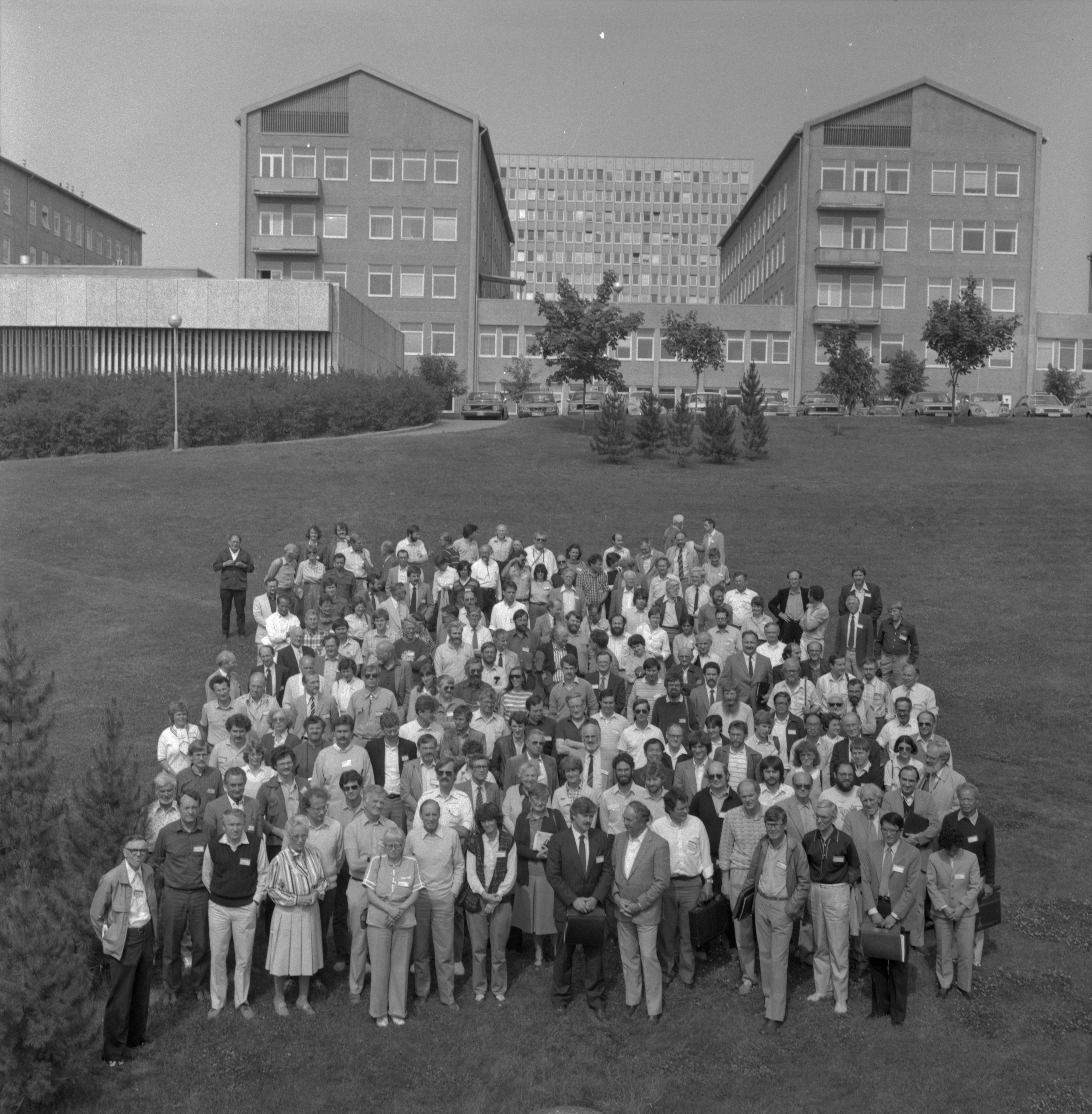 Radiologisk konferanse. Gruppebilde i gressbakken sør for Gløshaugenplatået med Kjemiblokkene bak.