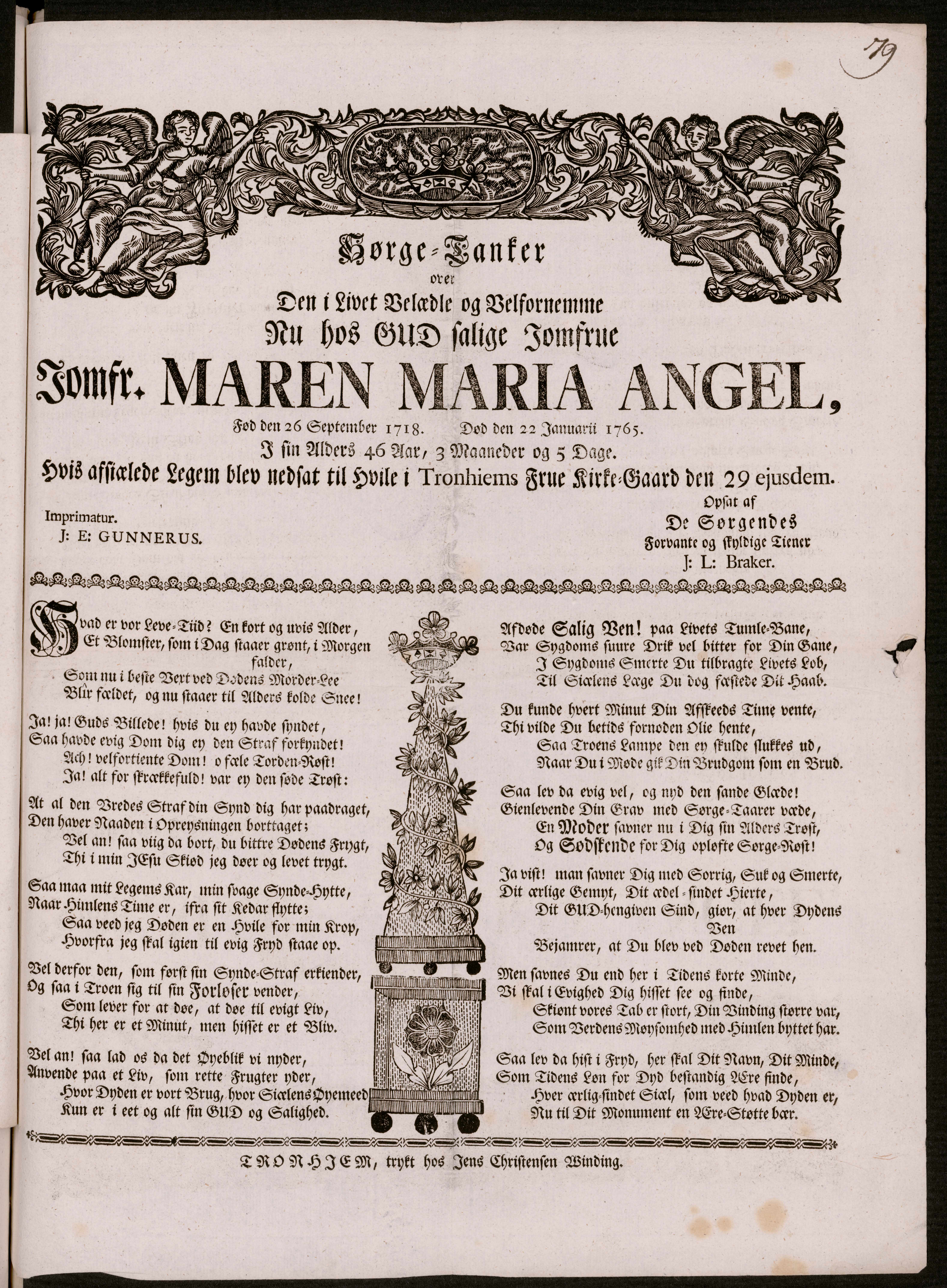 Begravelsesvers fra 1765 for Maren Maria Angel