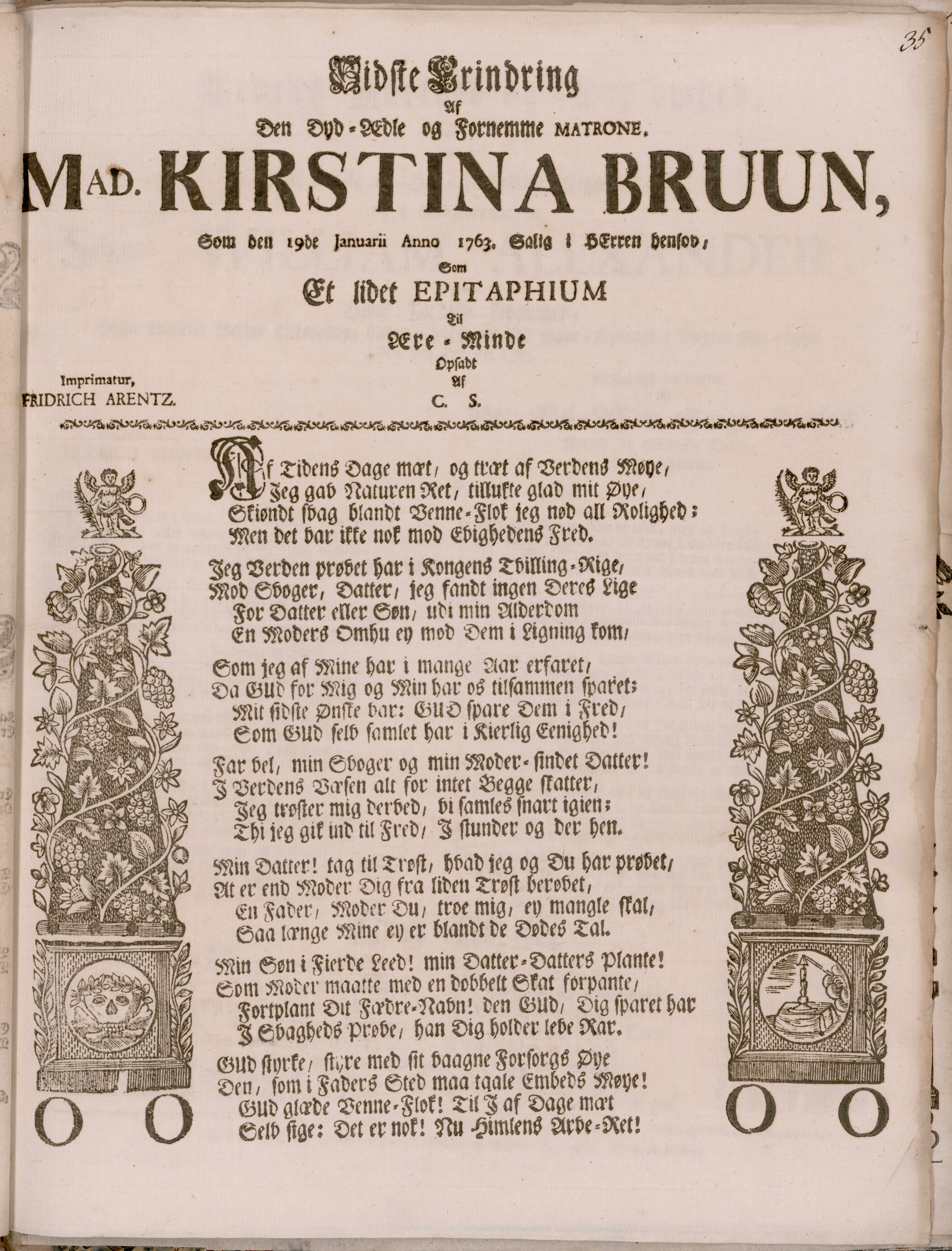 Begravelsesvers fra 1763 for Kirstina Bruun