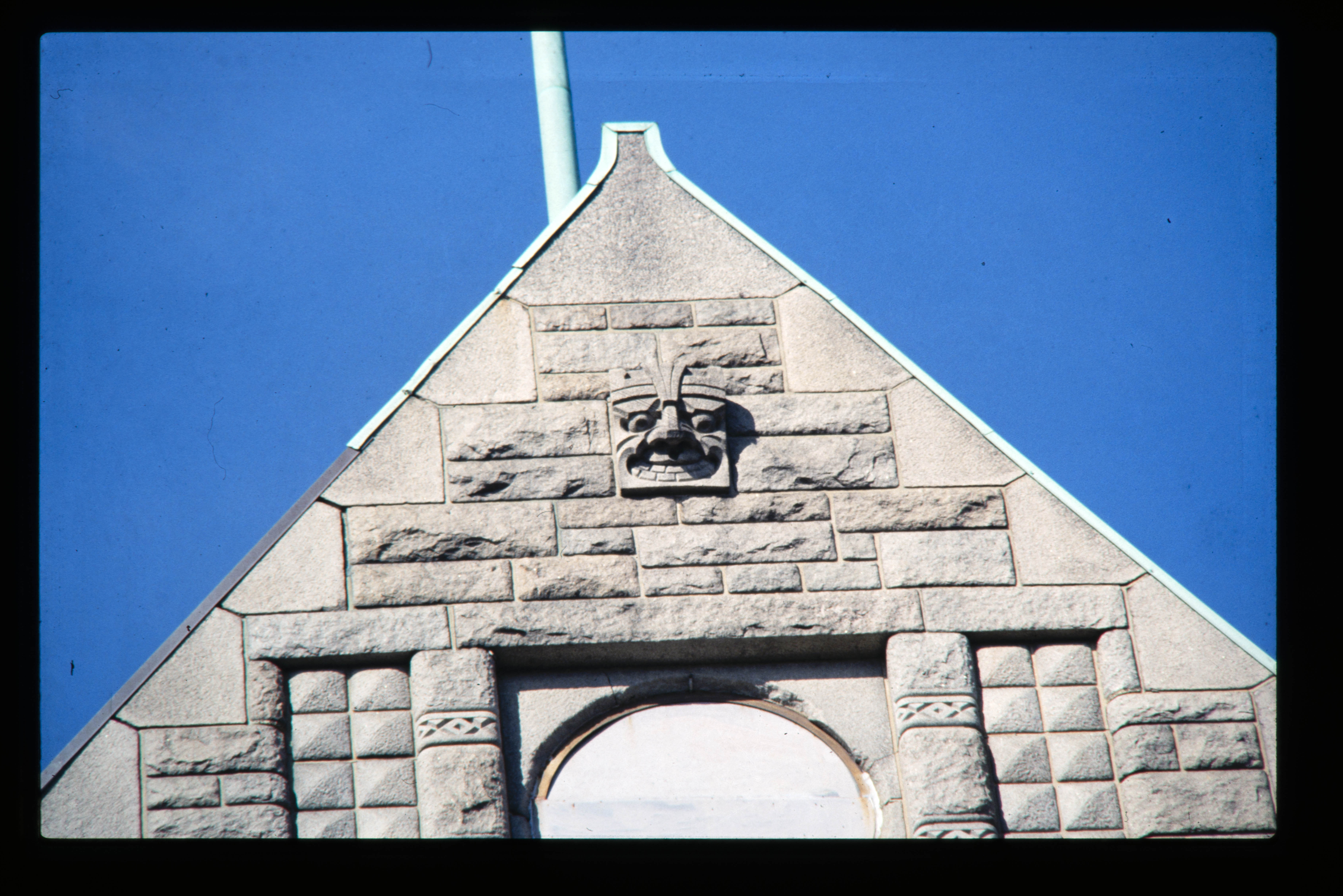 Posthuset i Dronningens gate 10, Trondheim. Hovedgavl med maske. Tegnet av arkitekt K. Norum og oppført i 1911.