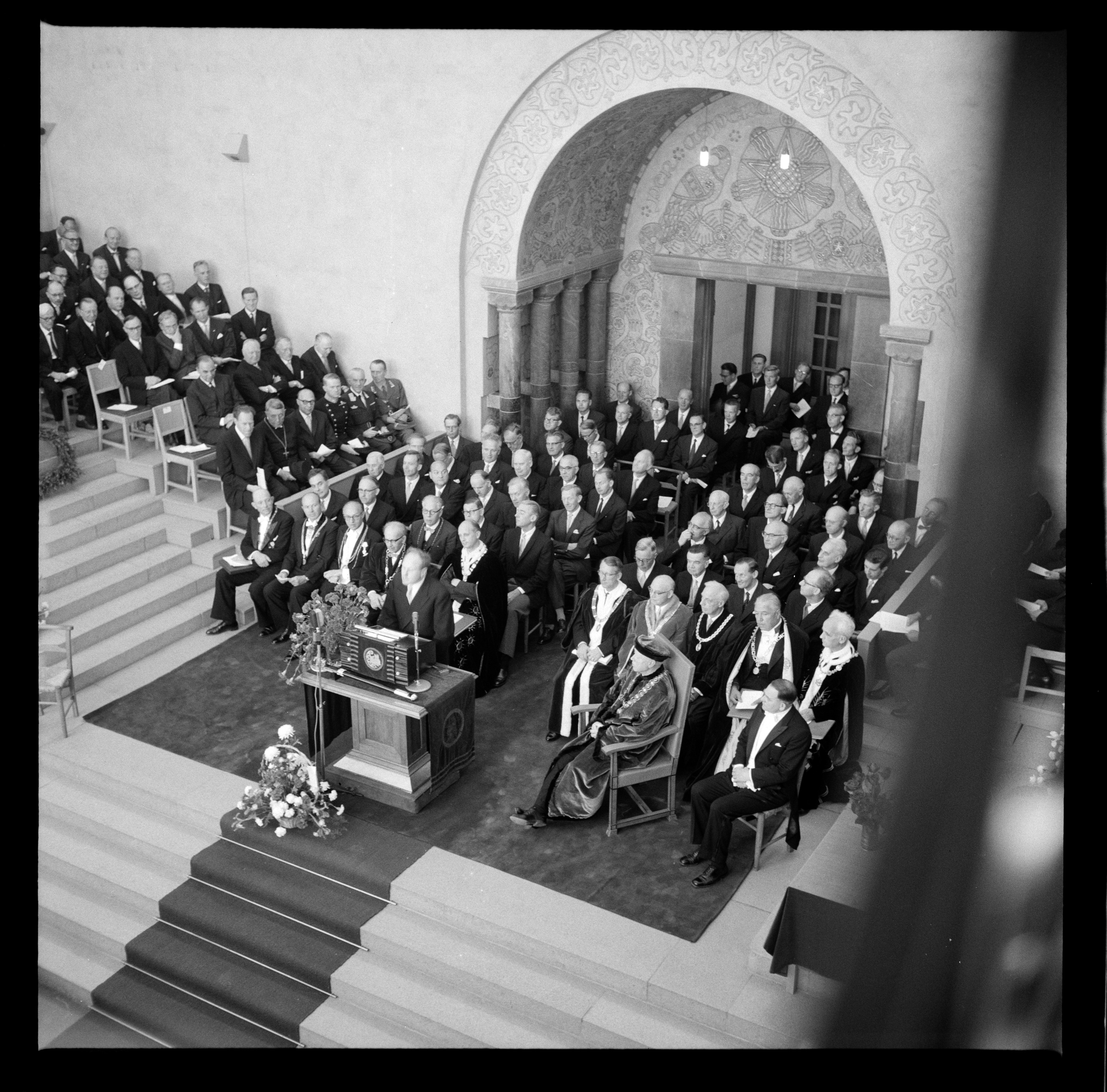 Markering i forbindelse med NTHs 50-årsjubileum i aulaen i Hovedbygningen hvor Kong Olav og Kronprins Harald var til stede.