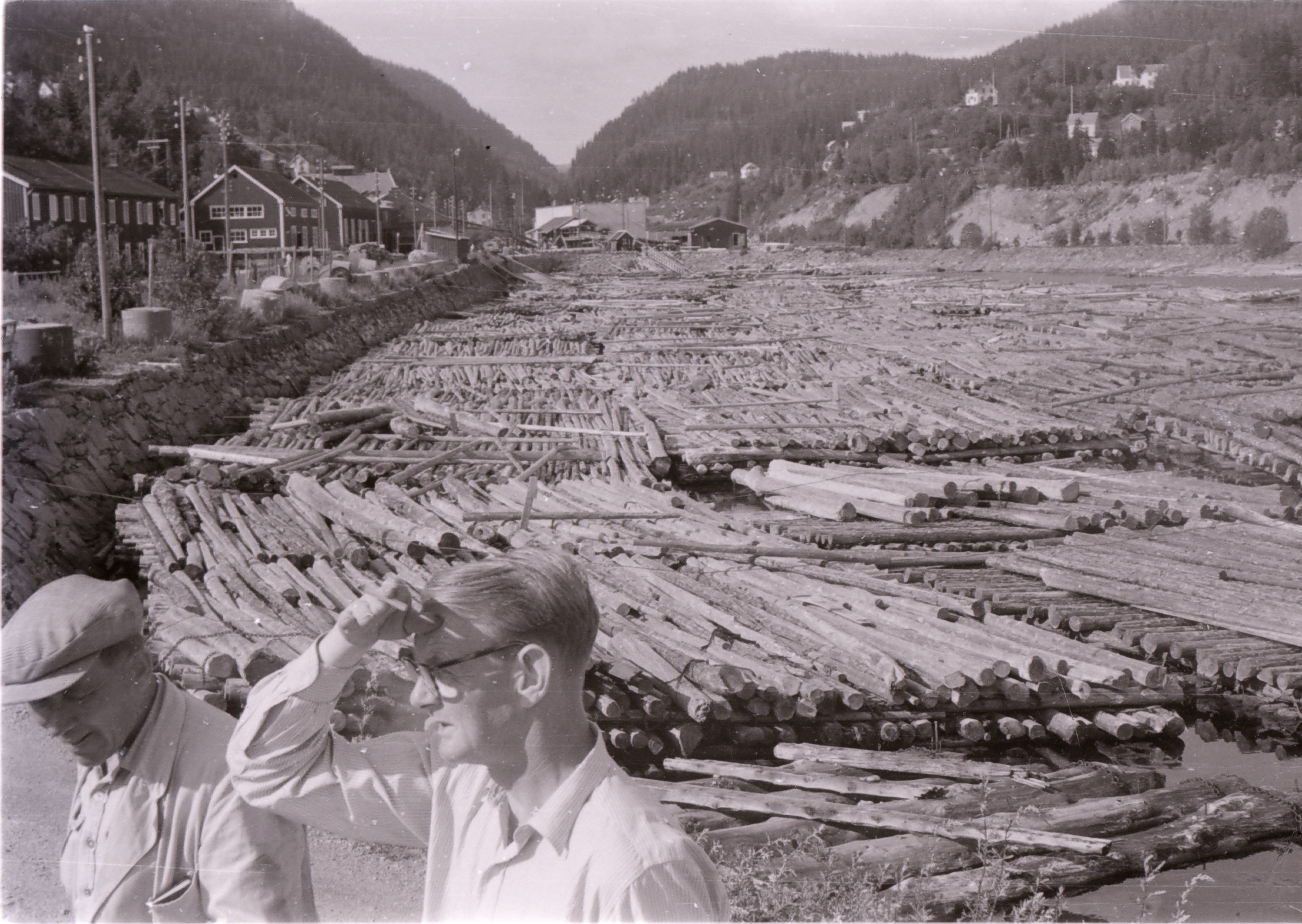En elv full av tømmer.