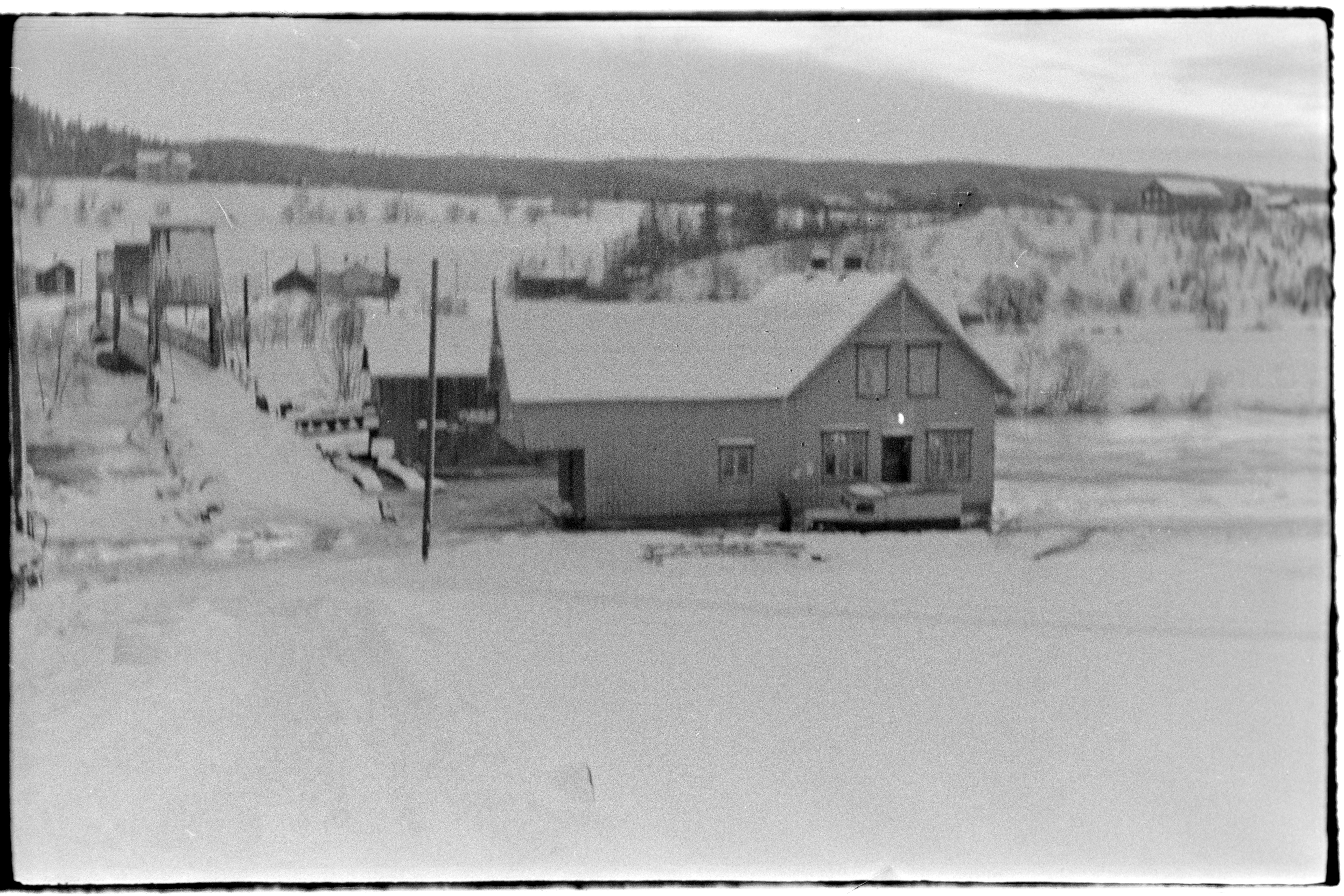 Et gårdstun med bolighuset i forgrunnen er omgitt av frosset vann. Naturskade, oversvømmelse med is.