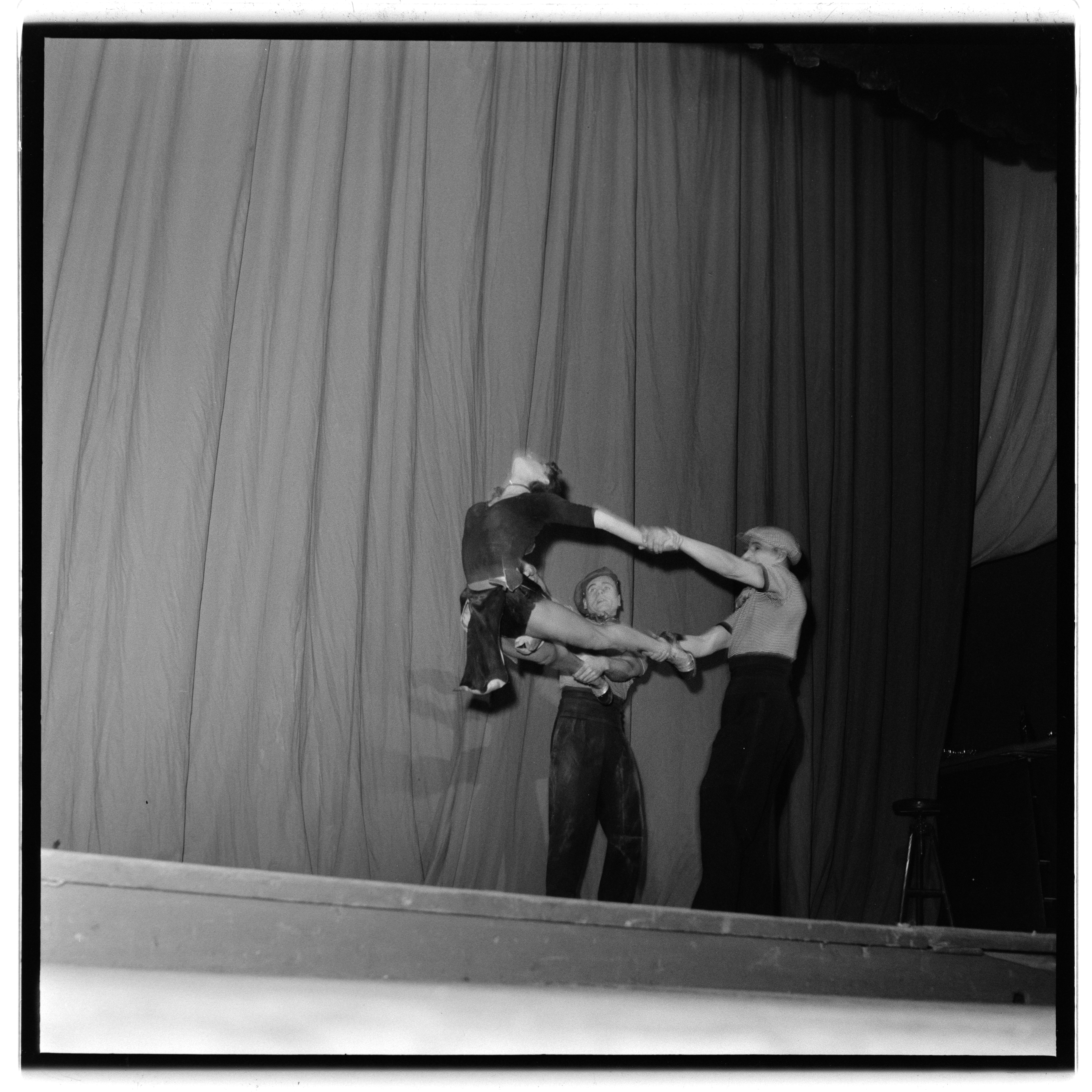 Møte viet dikteren Dylan Thomas med Harald Sverdrup og Arne Aasgaard. Kunsterisk innslag ved tre akrobater.