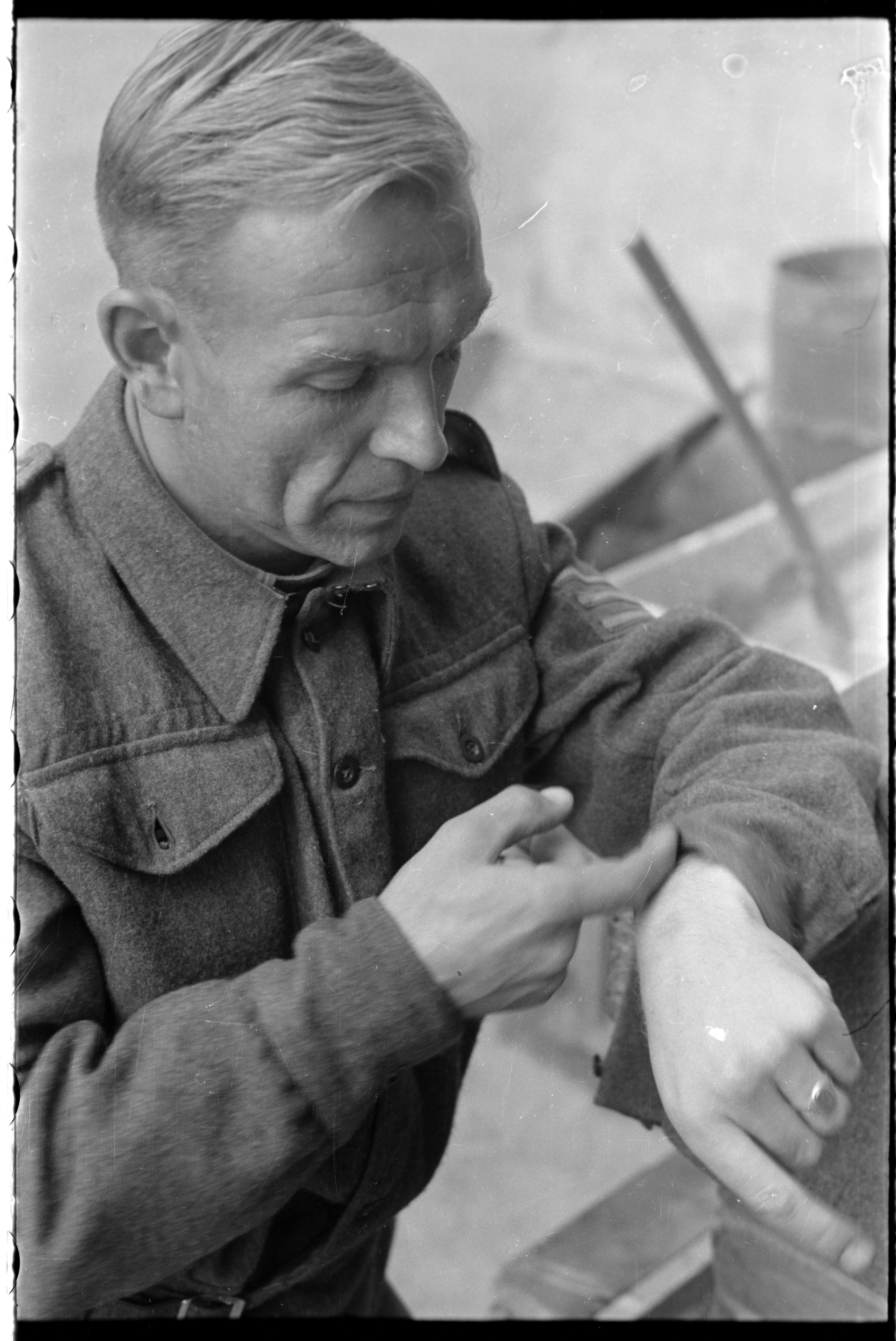 Påskrevet ytre emballasje: 67. Fra kongebesøket 1945, bilder fra kassernen, Sersj. Brox, Tor Johansen