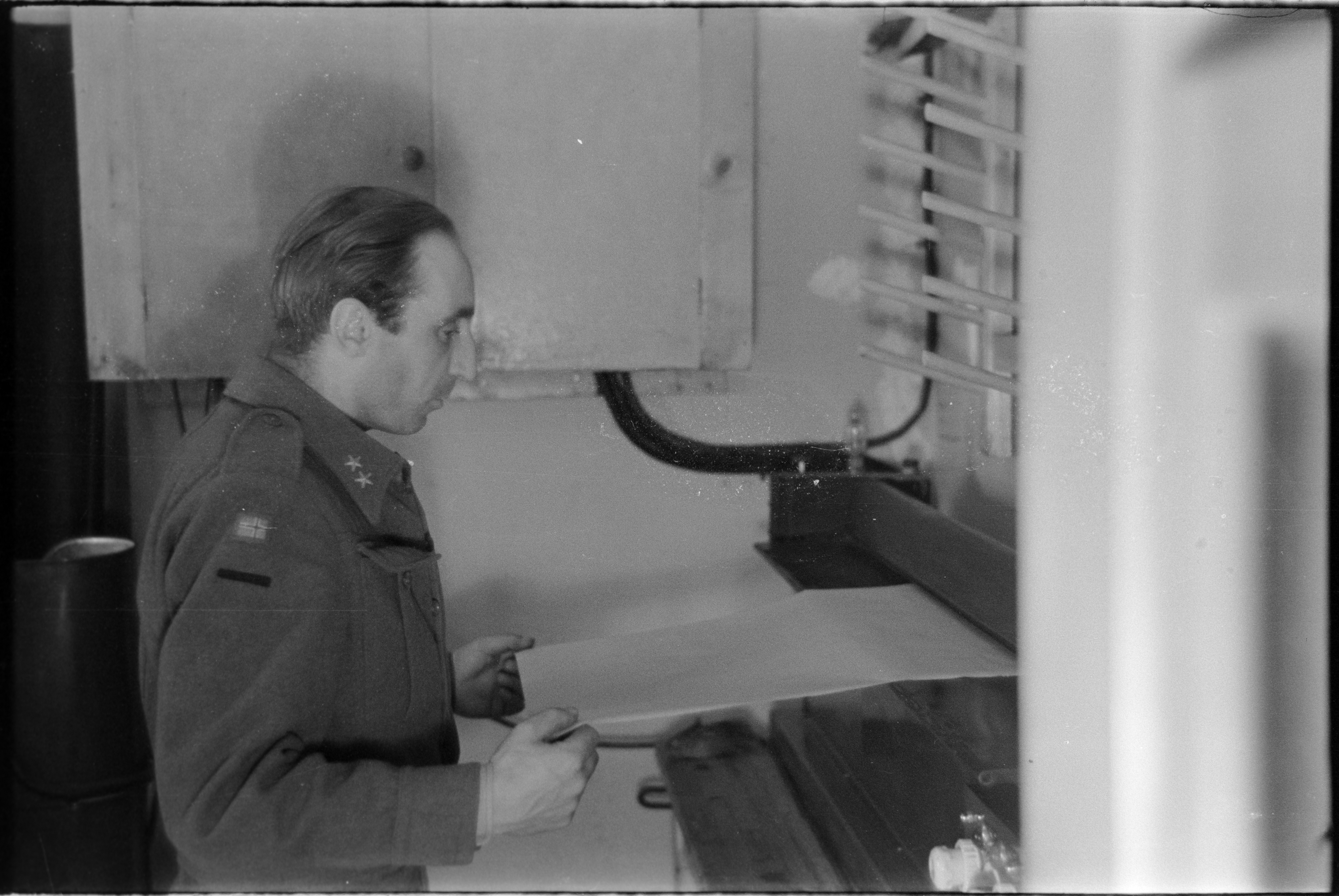 En mann i uniform med et større ark i hendene som går inn i en maskin. Trolig et arbeidsrom dokumentkopiering for Distriktskommando Trøndelag i Forsikringsgården i Søndre gate 14 i Trondheim.