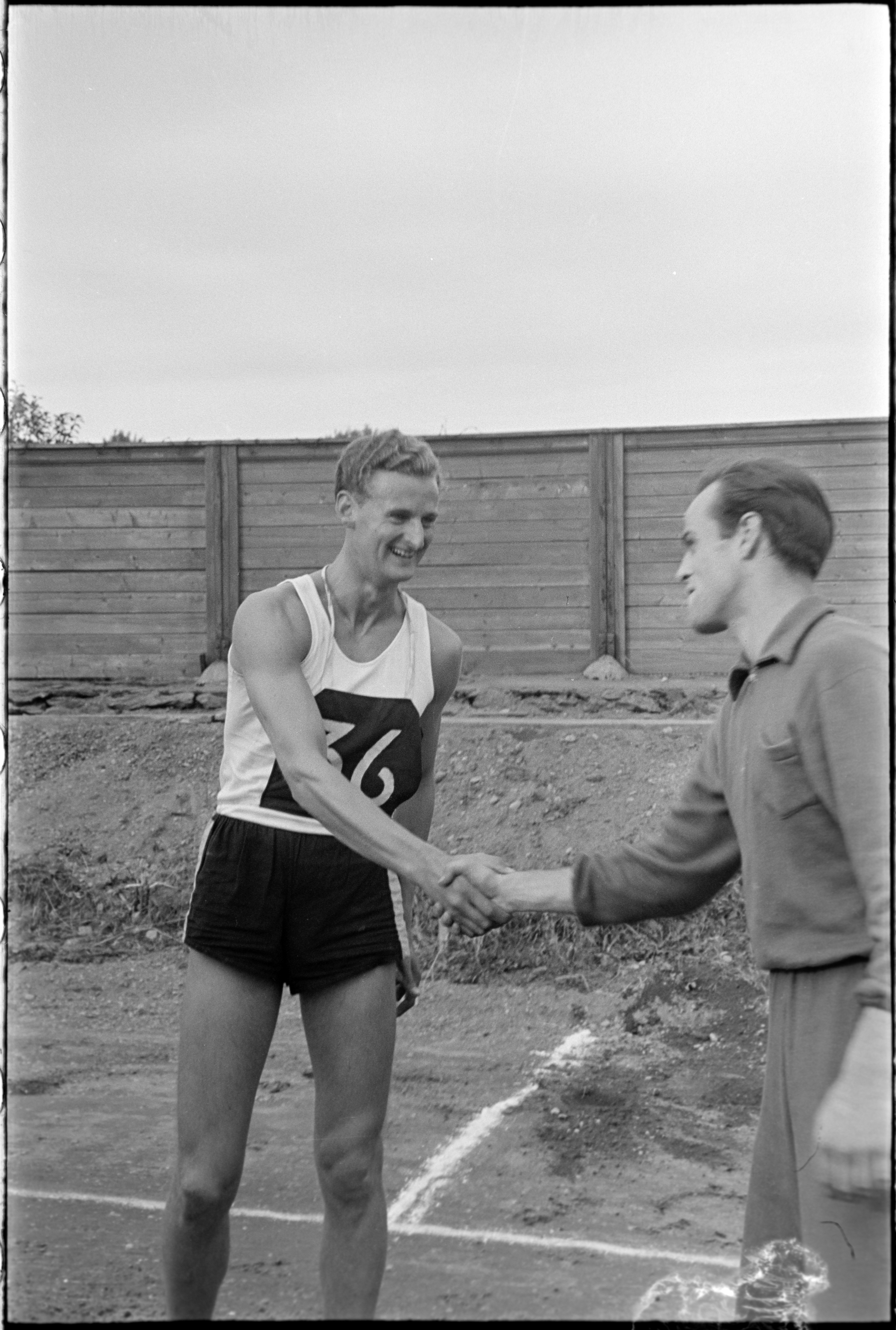 Fra militært mesterskap i friidrett som ble avholdt på Øya stadion i Trondheim i midten av september 1945. En av deltakerne gratuleres.